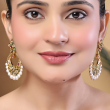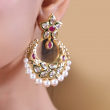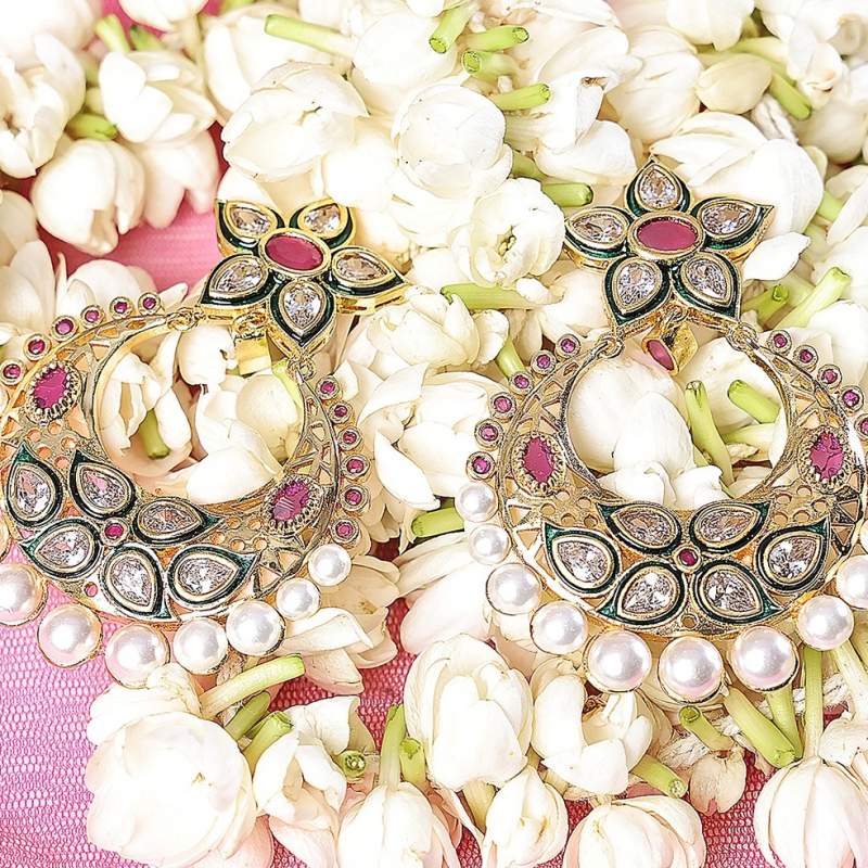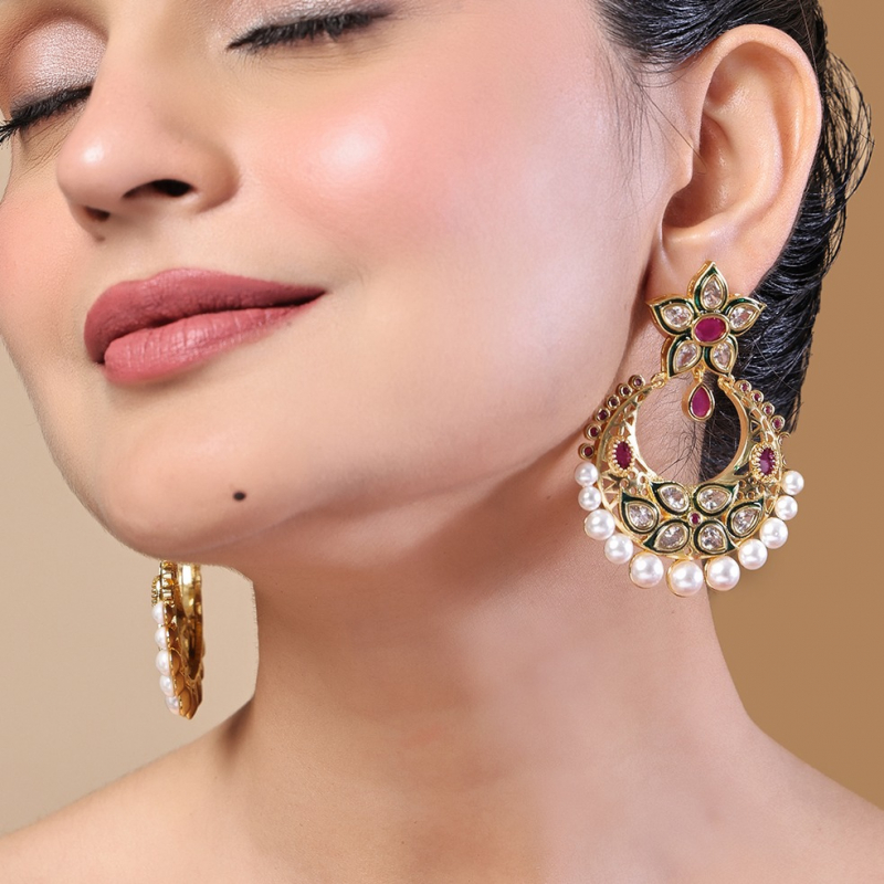 Elevate your ethnic elegance with these beautifully crafted chandbali earrings, featuring a delicate floral stud design at the top. Adorned with shimmering kundan stones and rich ruby-toned accents, the crescent-shaped chandbali is enhanced with intricate detailing and finished with graceful pearl drops. The blend of traditional craftsmanship and vibrant colors makes these earrings perfect for weddings, festive occasions, and special celebrations.