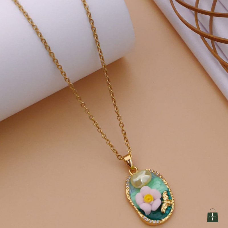 Add a touch of charm and elegance to your jewelry collection with this beautifully crafted oval floral pendant necklace. Designed with a refreshing mint-green enamel base, the pendant showcases a delicate pastel pink flower at the center, accented by a soft yellow core that adds warmth and vibrancy. A subtle pearl-style element at the top brings a refined, graceful finish to the overall design.