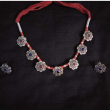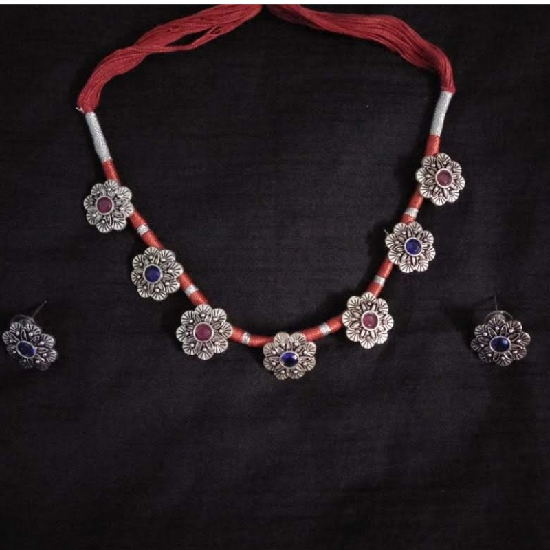 Elegant red-thread necklace set with silver oxidized flower motifs inset with alternating red and blue gemstones. The set includes a necklace with adjustable red cord and matching stud earrings. Ideal for ethnic or casual wear, it adds a vibrant touch to any outfit.