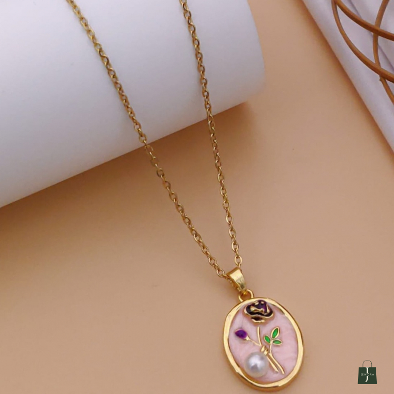 Add a touch of delicate elegance to your jewelry collection with this beautifully crafted floral enamel pendant necklace. Designed with a soft blush pink oval base, the pendant features an artistic floral motif accented with a subtle pearl-style bead and fine gold detailing. The combination of pastel tones and gold elements creates a graceful, feminine look that feels both modern and timeless.