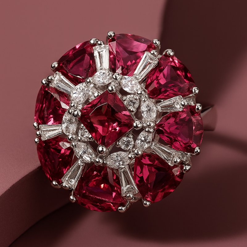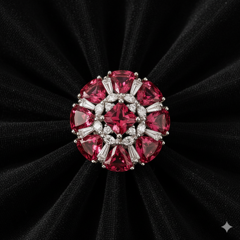 Floral Ruby-Inspired AD Cocktail Ring is a dazzling statement piece designed for women who love bold and luxurious jewellery. The ring features a radiant floral cluster design with ruby-inspired stones beautifully arranged around a central square solitaire. Surrounded by sparkling American Diamonds (CZ) in baguette and round cuts, this ring captures the perfect blend of traditional charm and modern elegance. Crafted on a high-quality alloy base with premium silver polish, this ring is durable and stylish, making it an ideal choice for weddings, festive celebrations, cocktail parties, or grand occasions. The floral motif symbolizes elegance and beauty, while the vibrant stones add a touch of royalty to your look. With its adjustable free-size band, this ring ensures comfort along with style. Part of our exclusive AD Jewellery Collection, this cocktail ring is perfect for women who want to turn heads and make a fashionable statement with timeless sparkle.