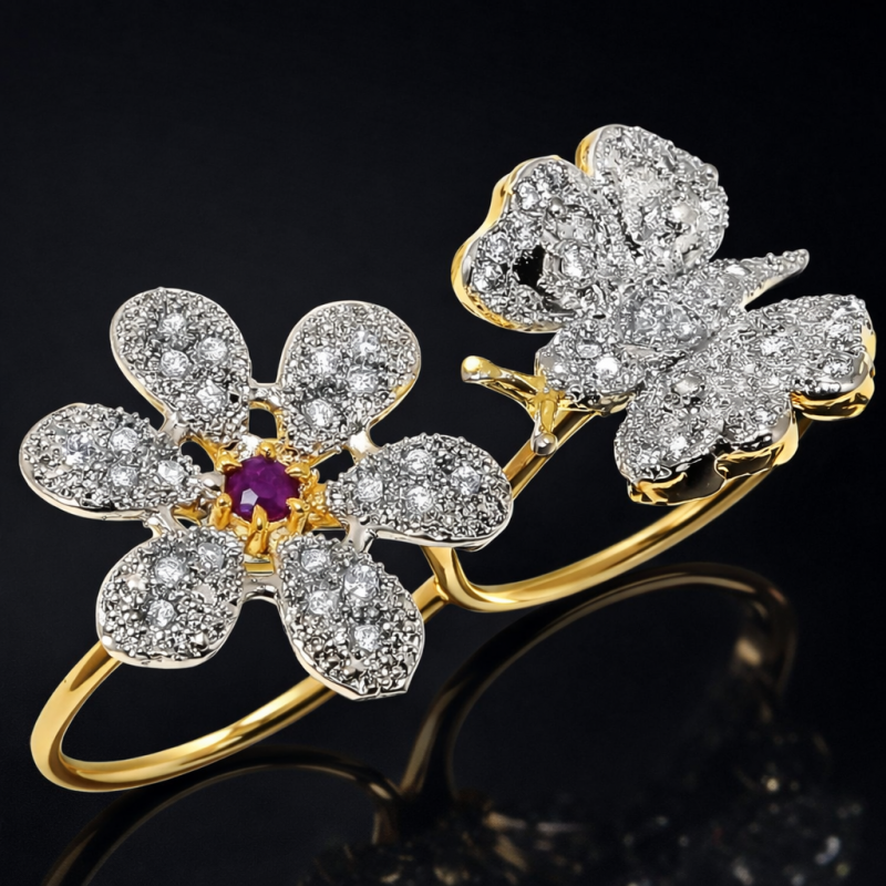 A gold adjustable ring featuring flower and butterfly-shaped motifs. The left flower has a central purple gemstone (likely ruby) surrounded by diamond-like stones on its petals, while butterfly is set entirely with diamond-like stones. The design combines silver-tone and gold-tone finishes.