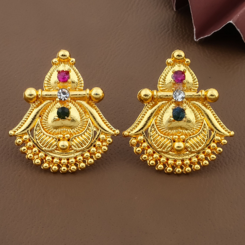 This stylish combo set features two beautifully crafted earrings designed to enhance your ethnic look. The first pair showcases an intricate floral filigree stud design with a vibrant pink stone at the center, giving it a graceful and elegant appearance. The second pair features a traditional drop-style earring adorned with pink, white, and green stones along with delicate bead detailing for a classic ethnic touch. Finished with rich gold polish, these earrings are perfect for festive occasions, weddings, and everyday traditional wear.