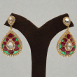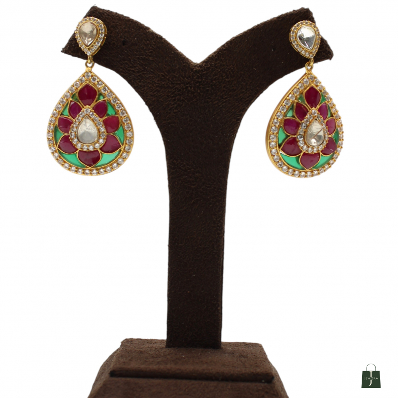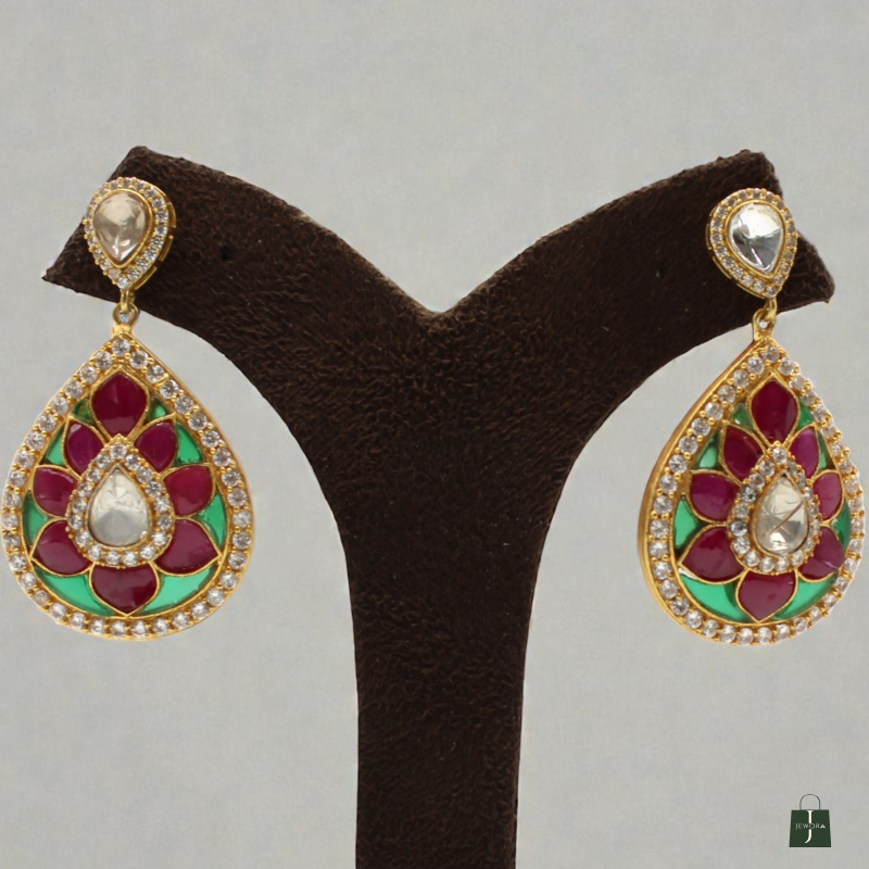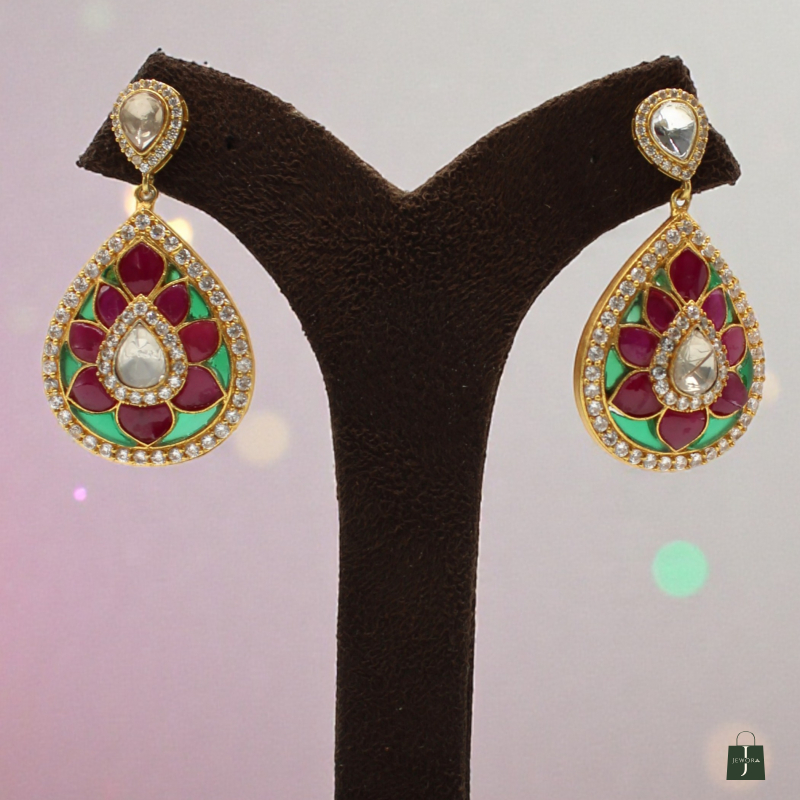Add a vibrant touch to your ethnic look with these beautifully crafted teardrop earrings featuring a floral-inspired design. The earrings showcase rich ruby pink petal stones arranged over a fresh green enamel base, highlighted with a central teardrop crystal stone. Surrounded by delicate white stone accents and finished in premium gold polish, these earrings offer a graceful blend of tradition and elegance.