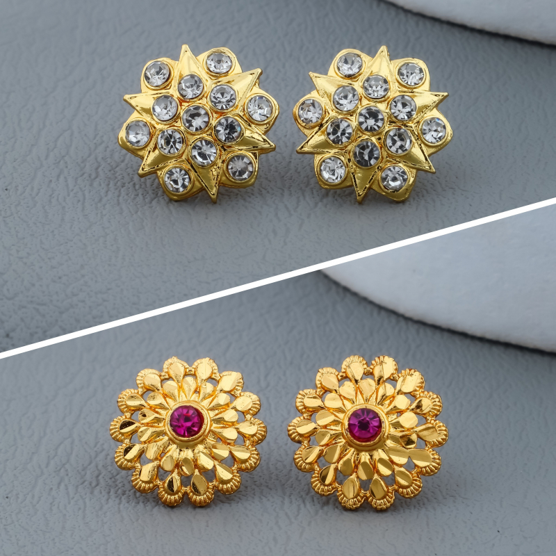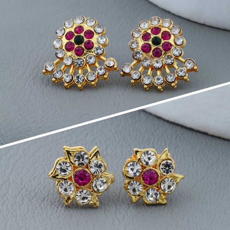 Enhance your jewellery collection with this beautiful 5-pair earrings combo set featuring a variety of elegant floral and crystal stud designs. Crafted with a rich gold-tone finish and sparkling artificial stones, this combo offers a perfect mix of traditional charm and modern style. These lightweight earrings are comfortable to wear and ideal for daily wear, festive occasions, weddings, and parties.