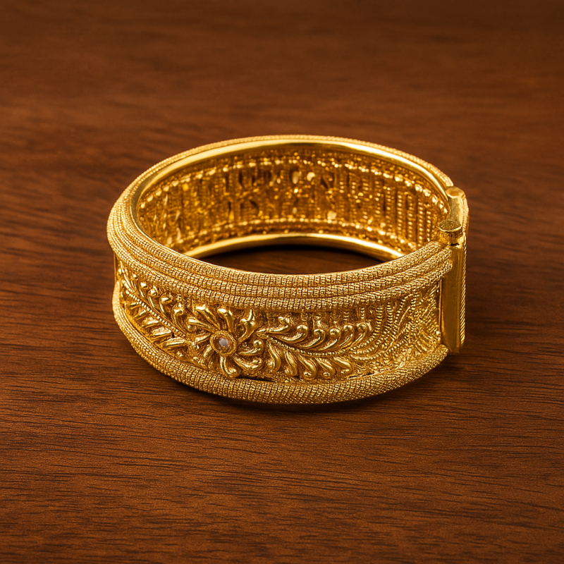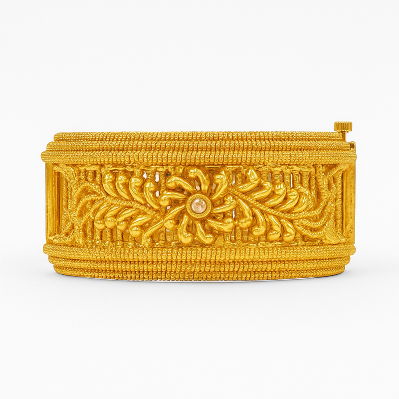 The Floral Vine Gold Kada Bangle is a magnificent piece of traditional jewelry, featuring intricate floral and vine motifs carved with precision. Finished in rich gold polish, the bangle showcases fine detailing with a central floral highlight surrounded by leafy patterns, creating a perfect balance between elegance and grandeur. The kada comes with a secure screw closure, making it both stylish and comfortable for all-day wear. Ideal for festive celebrations, cultural occasions, and weddings, this statement bangle embodies heritage craftsmanship and timeless beauty, making it a standout addition to any jewelry collection.