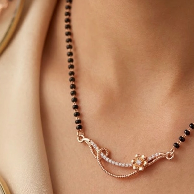 Elegant CZ rose gold mangalsutra featuring a delicate black bead chain paired with a graceful curved pendant. Adorned with sparkling cubic zirconia stones and a subtle floral accent, it offers a perfect blend of tradition and modern style for everyday elegance.