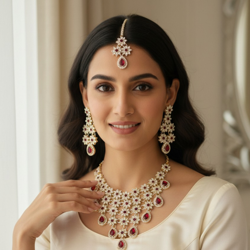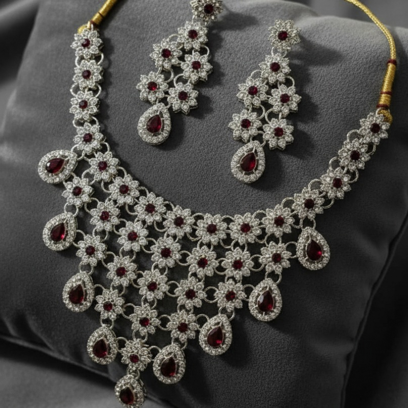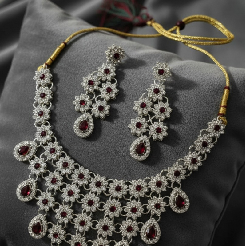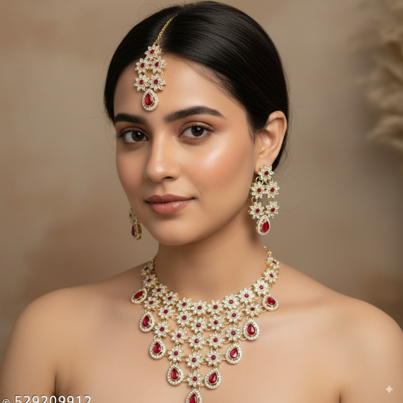 Add a touch of refined elegance to your look with the Frosted Crystal Designer Necklace. Crafted with beautifully frosted crystals and a sophisticated designer finish, this necklace sparkles with subtle charm. Perfect for parties, weddings, and special occasions, it effortlessly enhances both ethnic and western outfits. A statement piece designed to shine with grace.