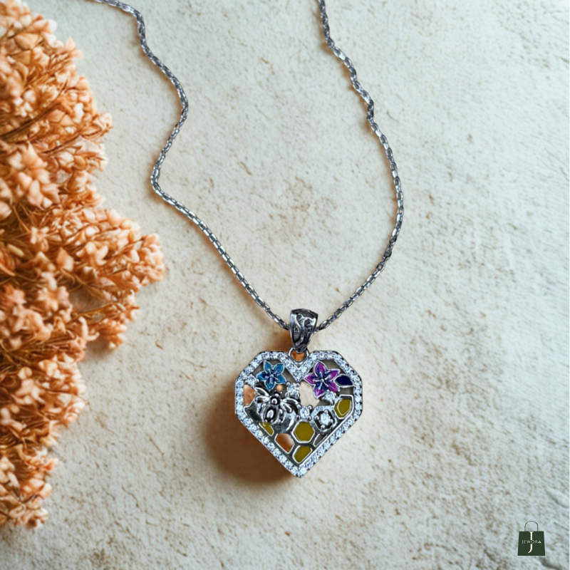 Let your heart bloom with color and charm. The Garden of Love Pendant is a whimsical heart-shaped necklace that blends romance, artistry, and nature in one striking design. Set in 92.5 Sterling Silver, this pendant features a mosaic of miniature flowers, playful yellow enamel detailing, and shimmering stones along the heart's edge, each element carefully crafted to express joy, femininity, and individuality. Heart-Shaped Elegance: Symbolizes love, life, and self-expression. A stunning gift for anniversaries, birthdays, or just because