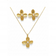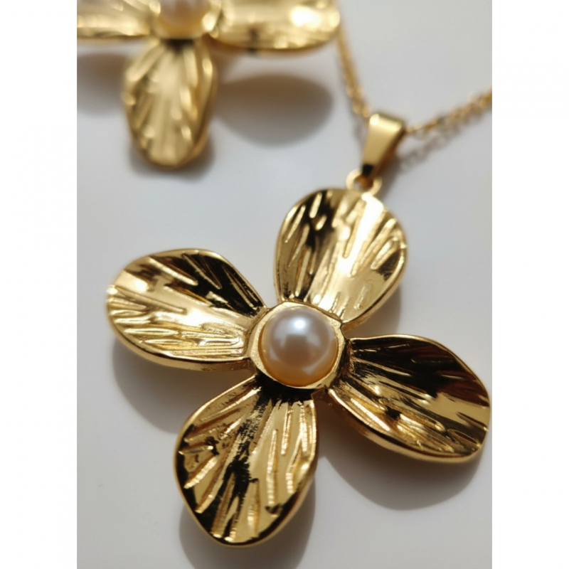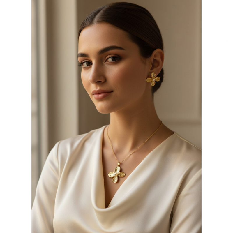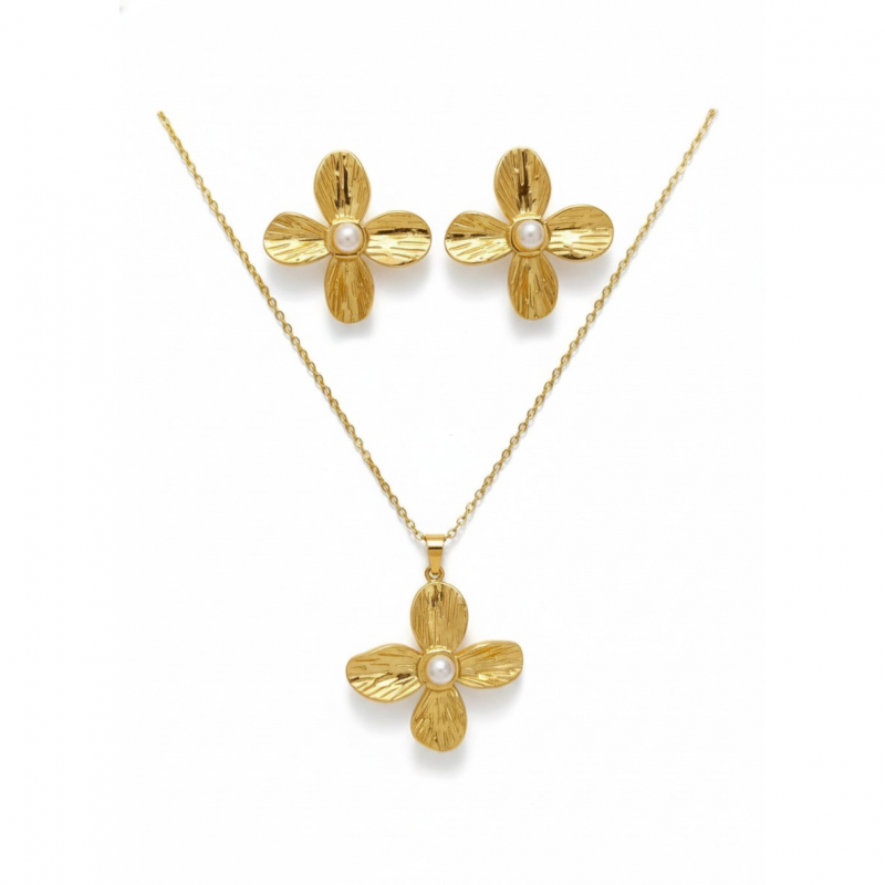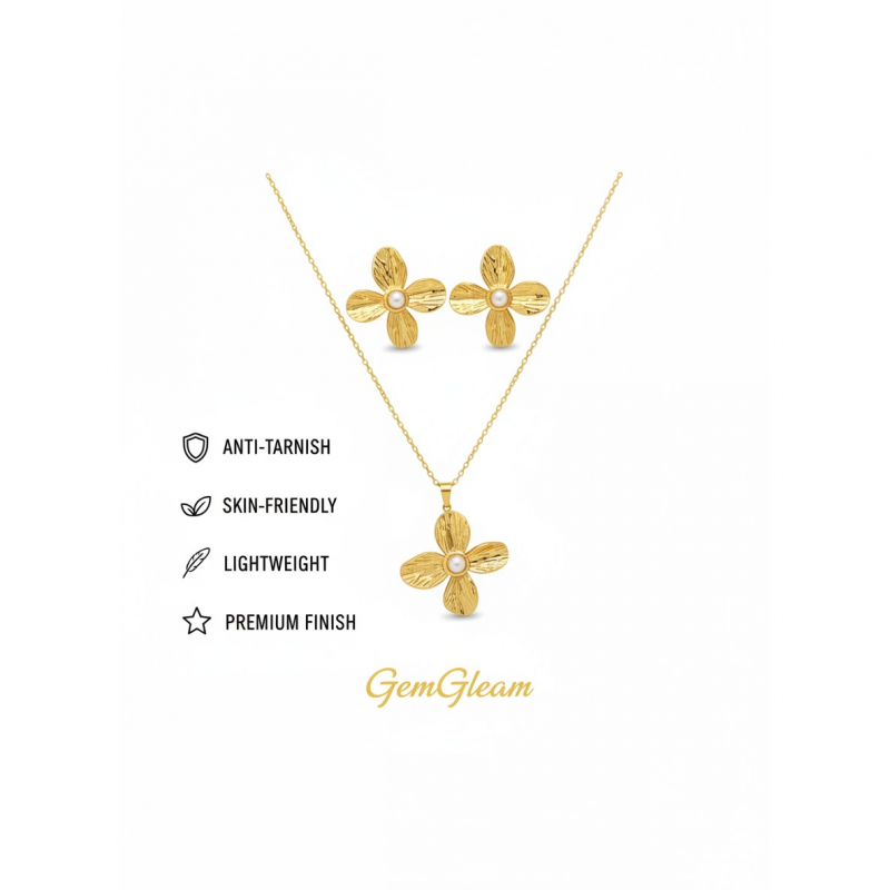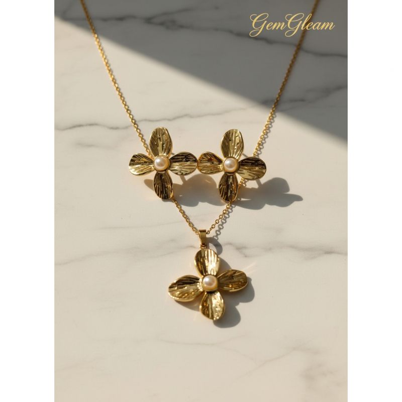 Add a touch of vintage charm to your everyday wardrobe with the GemGleam Textured Gold Floral Pearl Set. This beautifully crafted set features a delicate four-petal blossom design, brought to life with a unique, textured gold finish. At the heart of each flower lies a classic, lustrous pearl, striking the perfect balance between modern minimalism and classic elegance.