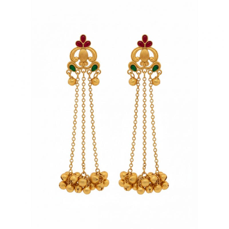 Designed with multiple delicate dangling chains and classic ghungroo bells, these long earrings create graceful movement and a festive charm with every step. Despite their statement look, they are lightweight and comfortable, making them ideal for long wear during weddings, festivals, poojas, and special occasions.