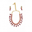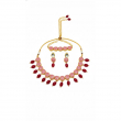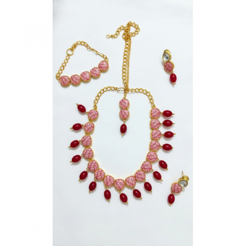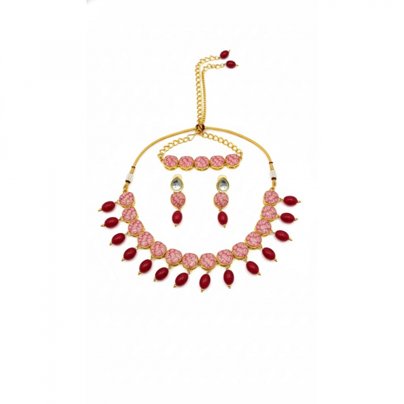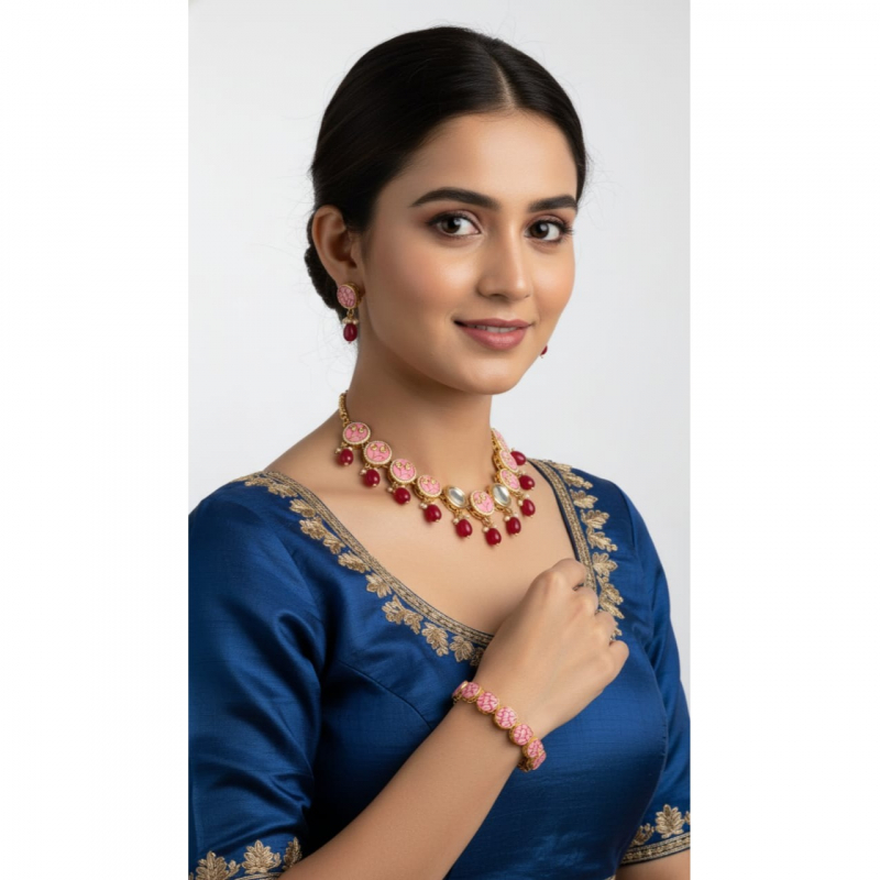 Enhance your festive and bridal look with the GemGleam Rosy Royale Meenakari Jewelry Set, a complete 4-in-1 collection that includes a stunning necklace, matching earrings, an elegant maang tikka, and a beautifully crafted bracelet. Designed with intricate pink Meenakari enamel work and rich ruby-toned beads, this set embodies traditional Indian craftsmanship with a modern, graceful touch. The gold-toned detailing adds a regal charm, making it perfect for weddings, engagements, festivals, haldi-mehendi functions, and special occasions. Lightweight, skin-friendly, and crafted with premium materials, this jewelry set ensures comfort without compromising on elegance. Step into any celebration with the timeless beauty of GemGleam.