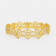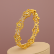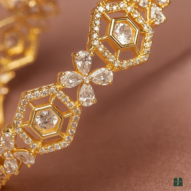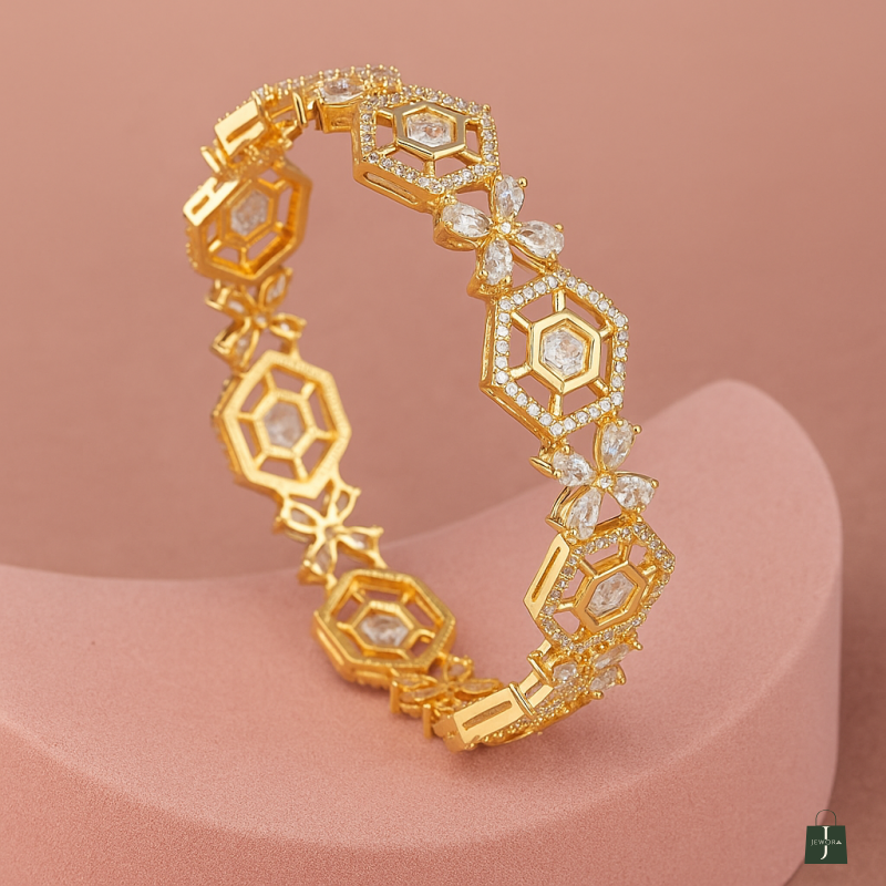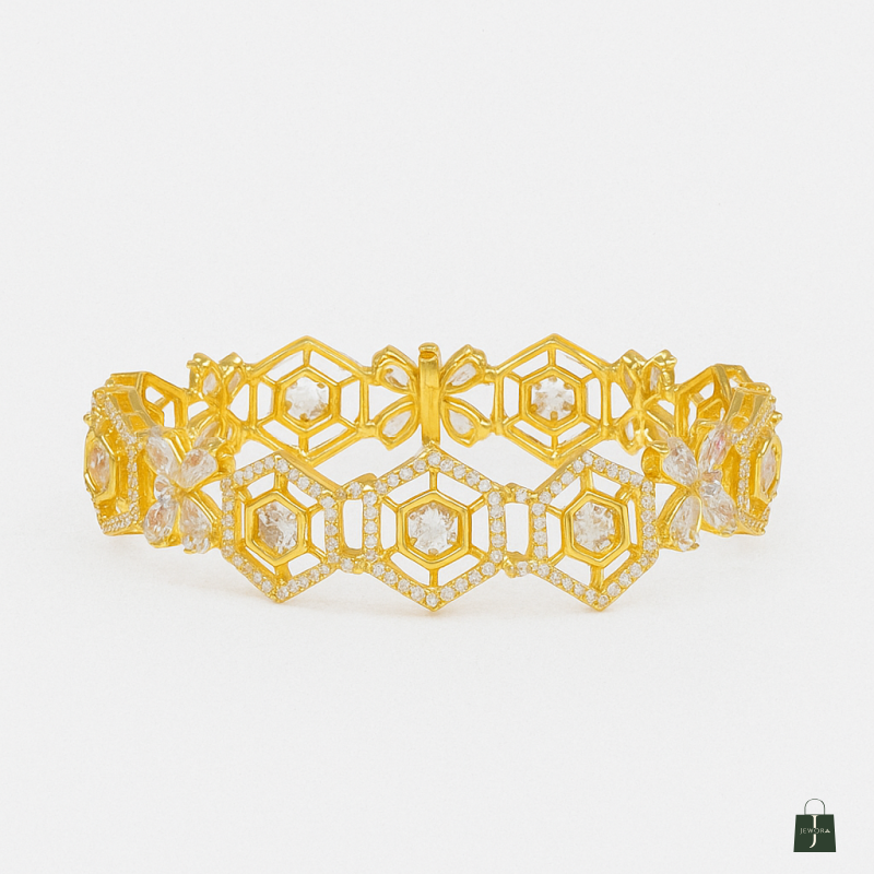 The Geometric AD Gold Bangle is a bold statement piece that beautifully blends contemporary design with traditional craftsmanship. Crafted with a radiant gold polish, this bracelet showcases a series of hexagon-shaped motifs intricately set with sparkling American Diamond (CZ) stones. The open lattice design adds a touch of modern artistry, while the large central solitaires enhance its luxurious appeal. Lightweight yet sturdy, this bracelet is designed to offer both comfort and elegance, making it an excellent choice for long wear during special occasions. Its unique geometric styling ensures it stands apart from conventional designs, giving the wearer an aura of exclusivity and sophistication. Perfect for parties, festive celebrations, and grand occasions, the bracelet pairs effortlessly with traditional attire like sarees and lehengas as well as western gowns and evening wear. Whether worn as a single standout piece or combined with other jewelry, the Geometric AD Gold Bracelet adds an edge of contemporary glamour to any ensemble. A versatile must-have, this bracelet is ideal for women seeking a modern yet elegant jewelry piece.