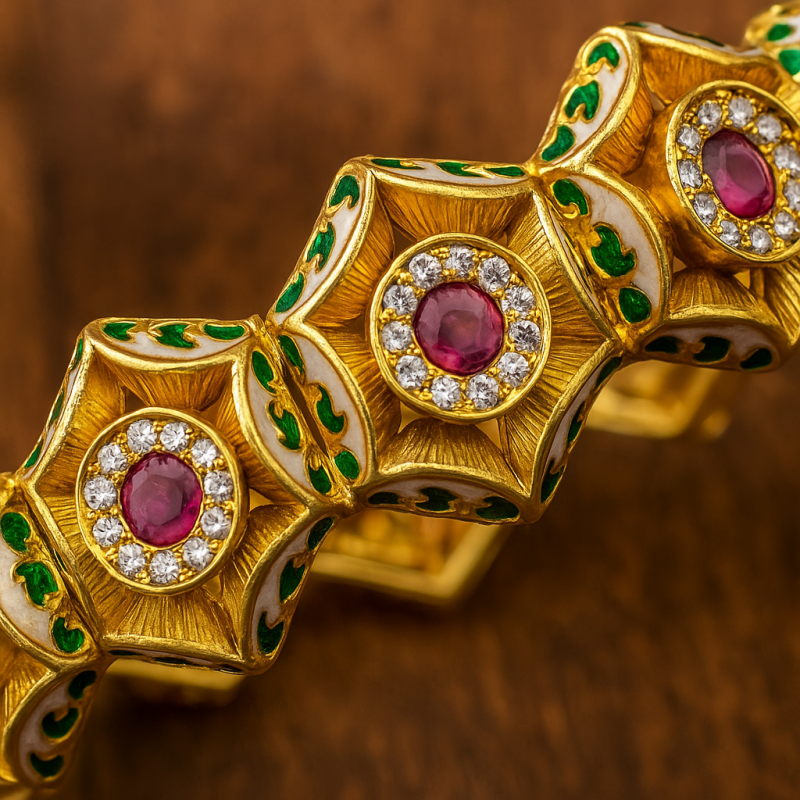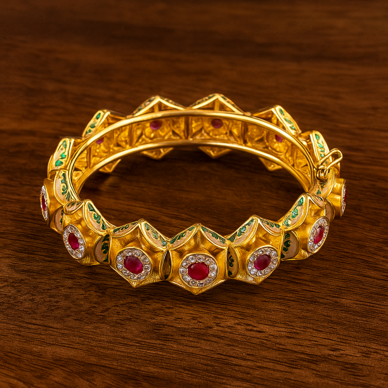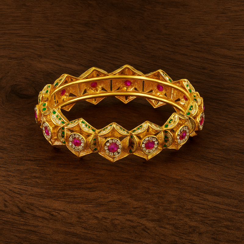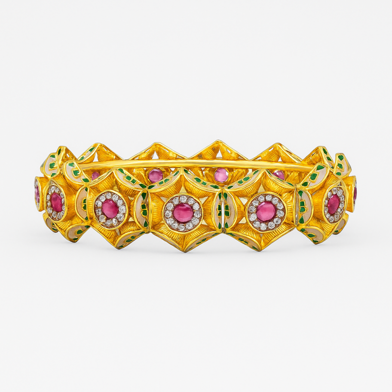 The Geometric Floral Ruby Kada Bangle is a stunning example of traditional artistry combined with modern geometric design. Crafted in alloy with a luxurious gold polish, this kada features a series of hexagonal motifs, each centered with a vivid ruby-like stone surrounded by sparkling accents. Delicate green enamel work further enhances its charm, adding a touch of regal finesse. The bangle comes with a secure screw closure for easy wear. Perfect for festive occasions, cultural celebrations, and weddings, this bangle makes a bold style statement while honoring heritage-inspired craftsmanship.