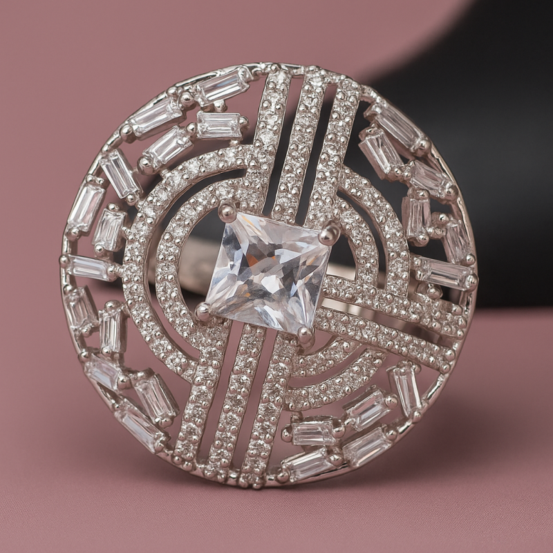 Geometric Solitaire AD Cocktail Ring is a modern and luxurious jewellery piece that radiates brilliance and sophistication. Featuring a square-cut solitaire centerpiece surrounded by concentric geometric layers of American Diamonds (CZ), this ring is designed to sparkle from every angle. Its unique combination of bold design and fine detailing makes it perfect for weddings, parties, and special occasions.