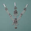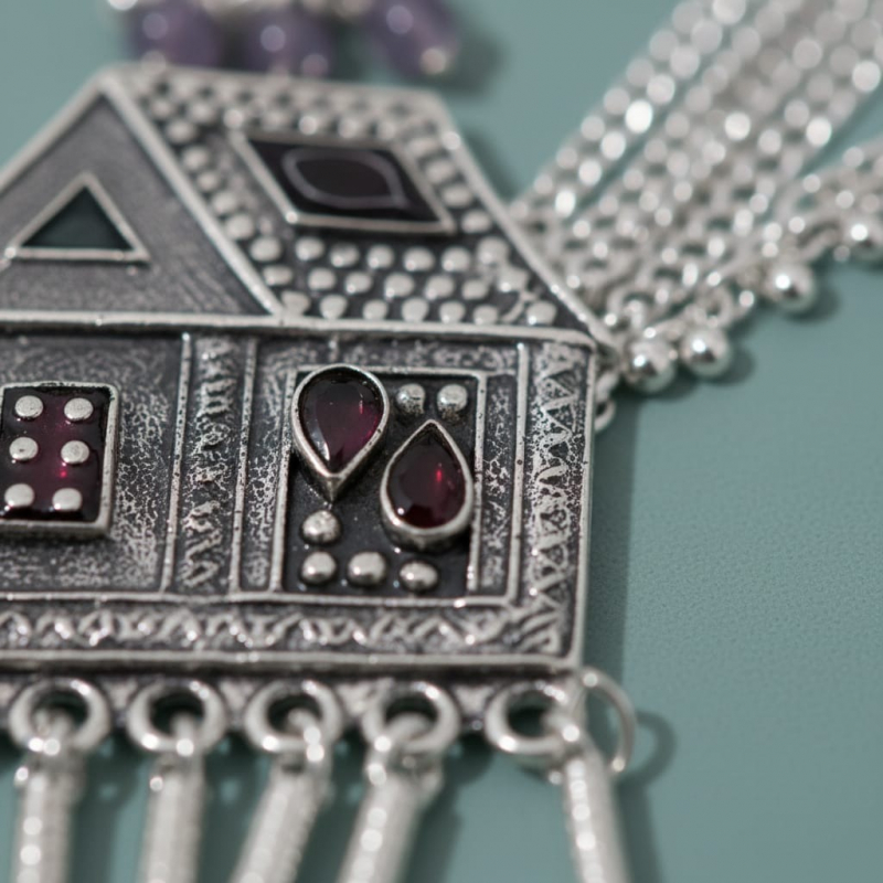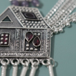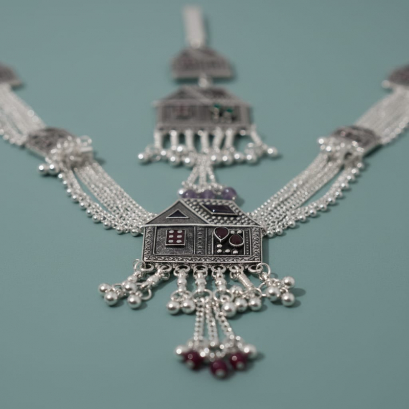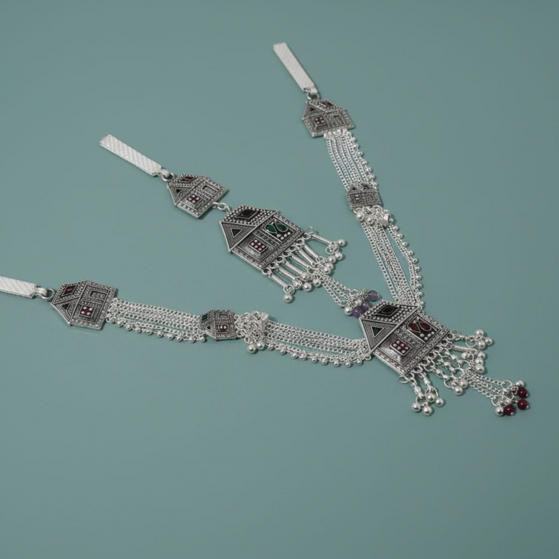 This artistic oxidised silver kamarbandh features beautifully crafted village house motifs that reflect traditional folk-inspired design. The layered chain structure gracefully connects the detailed house elements, creating a unique and eye-catching waist accessory. The central house pendant is adorned with delicate enamel accents and decorative metalwork, while the dangling ghungroo-style tassels add charming movement. Perfect for pairing with sarees, lehengas, and festive attire, this kamarbandh adds a distinctive ethnic touch inspired by rural heritage.