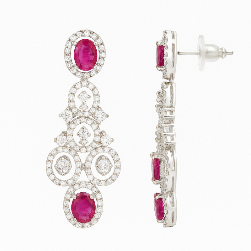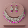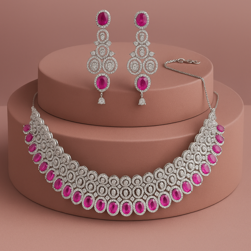 An elegant choker set crafted with intricate circular motifs, studded with sparkling American Diamonds (CZ) and vivid ruby red stones. The matching long drop earrings enhance its graceful look, making it the perfect jewellery choice for festive and party wear occasions.