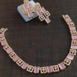 The jewellery set is a gold-toned necklace and earring combo featuring gemstones surrounded by diamond-like stones. The design has a symmetrical, elegant look and Comes in 4 design/ colour options to choose from.
