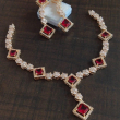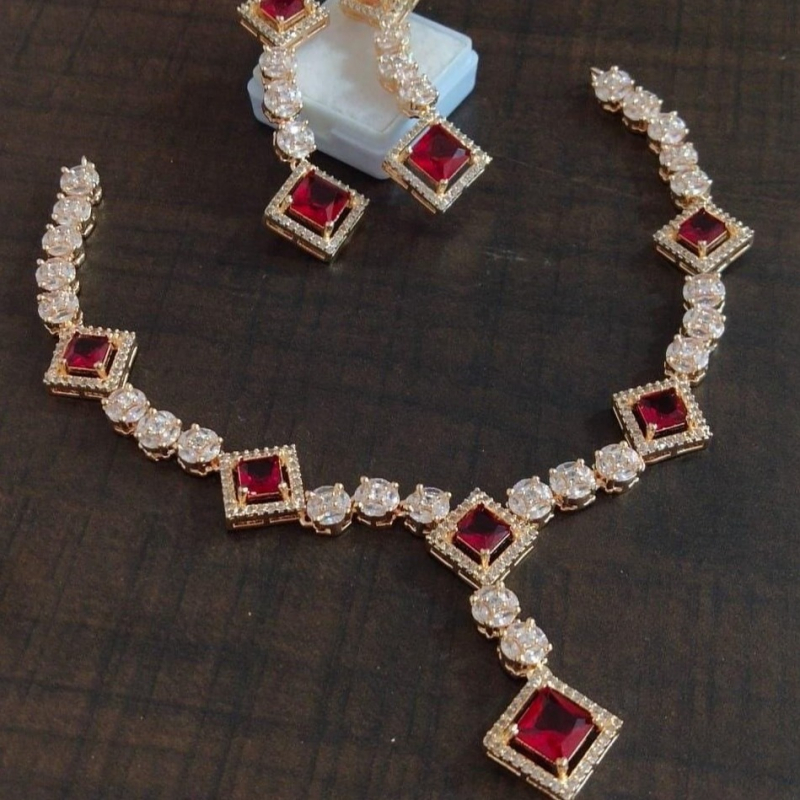 The jewellery set is a gold-toned necklace and earring combo featuring gemstones surrounded by diamond-like stones. The design has a symmetrical, elegant look and Comes in 4 design/ colour options to choose from.