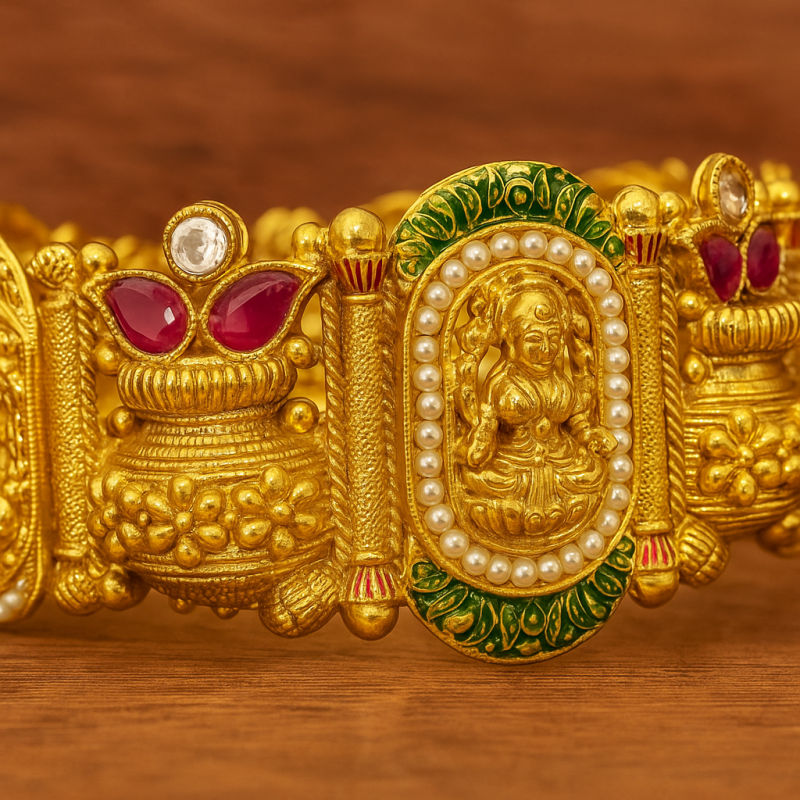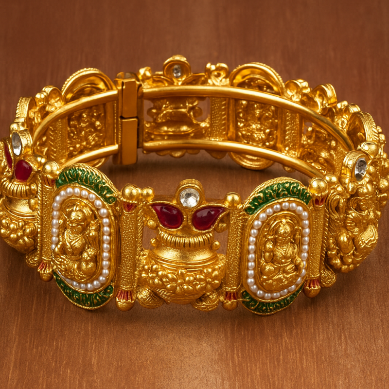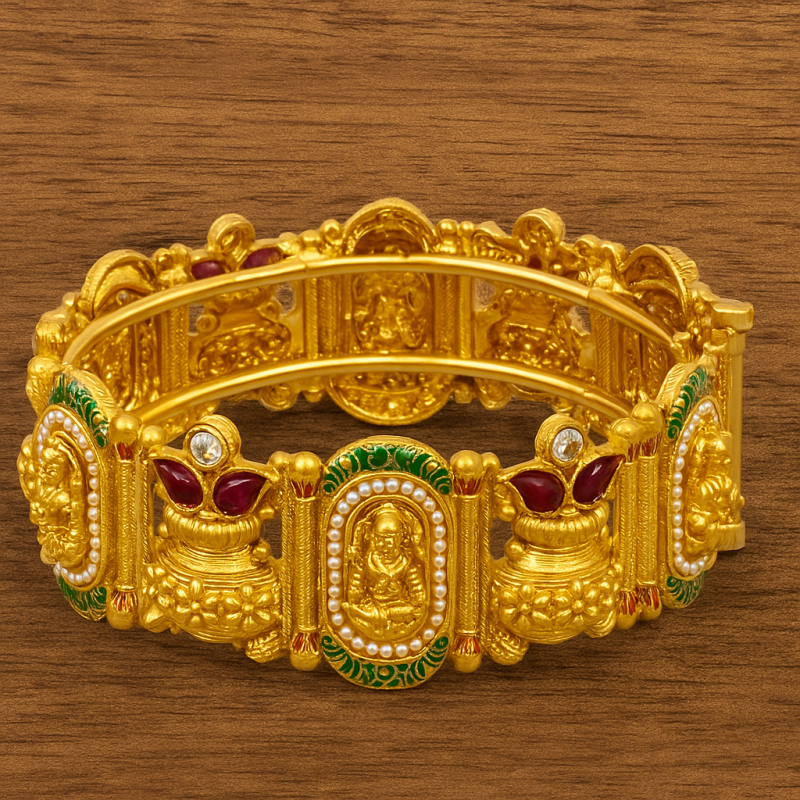 The Goddess Lakshmi Temple Kada Bangle is a magnificent piece of traditional craftsmanship, featuring the divine figure of Goddess Lakshmi at its center. Designed in rich temple jewellery style, this kada is adorned with Ruby Red and Emerald Green stones, American Diamond (CZ) highlights, and intricate pearled borders. The ornate carvings and temple-inspired motifs symbolize prosperity and grace, making it an auspicious accessory for brides and festive occasions. Crafted in alloy with a luxurious gold polish and a secure screw closure, this kada is a timeless blend of spirituality and elegance.