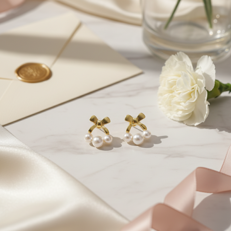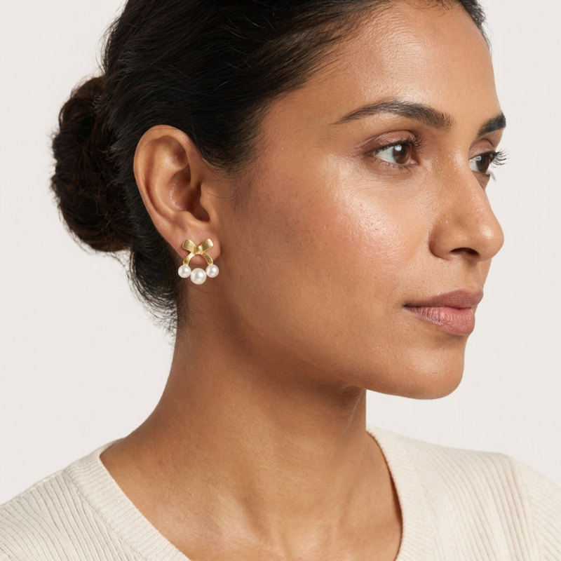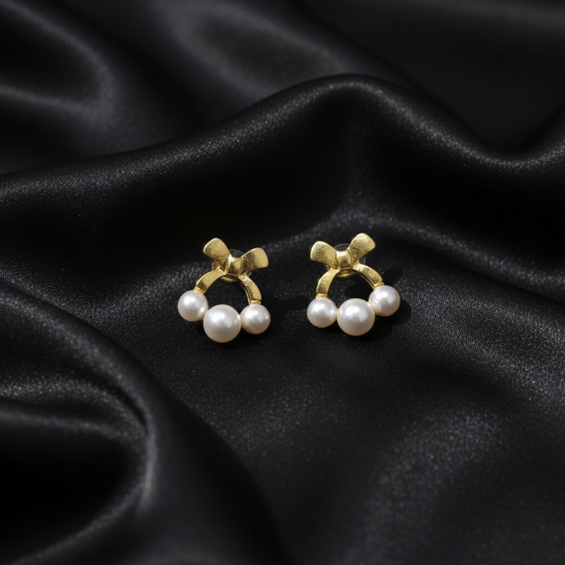 Effortlessly elegant and timelessly feminine — our Gold Bow Pearl Stud Earrings combine the classic charm of a golden bow with the lustrous beauty of three freshwater pearls, creating a delicate wreath-like silhouette that is simply irresistible.