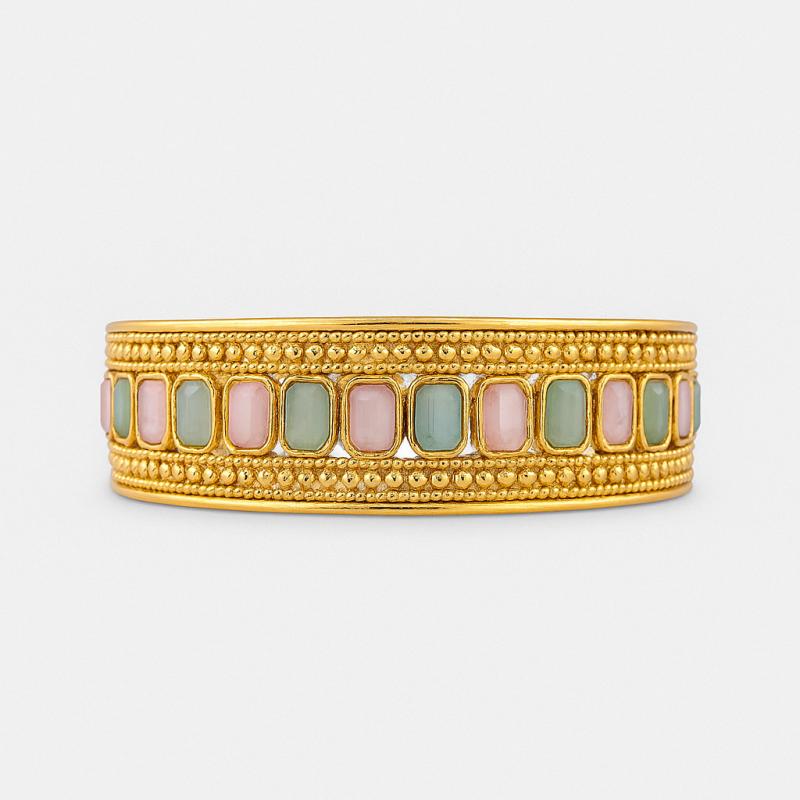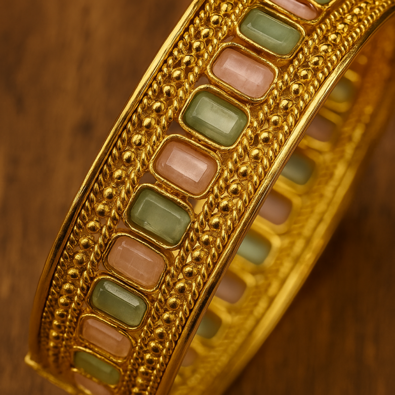 Add a touch of elegance to your festive and bridal look with this stunning Gold Filigree Kada, crafted with exquisite multicolor stones in soft peach and turquoise tones. Designed with intricate filigree detailing and finished in rich gold polish, this kada is a perfect blend of tradition and modernity. Made from durable alloy, it comes with a secure screw closure for a comfortable fit. Ideal for women who want to make a statement at parties, festive occasions, or weddings, this kada is a timeless piece you’ll cherish.