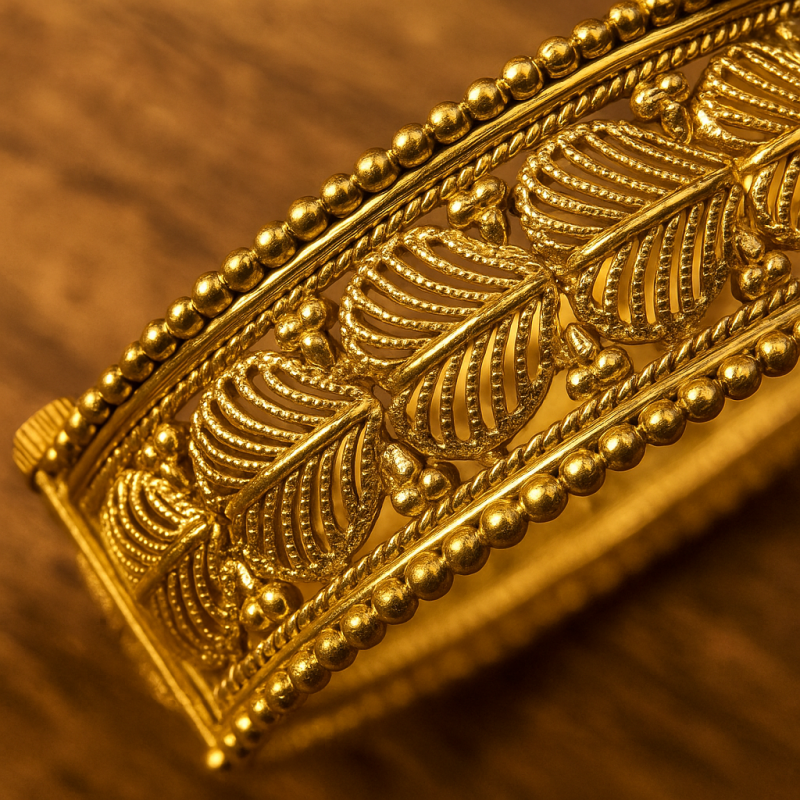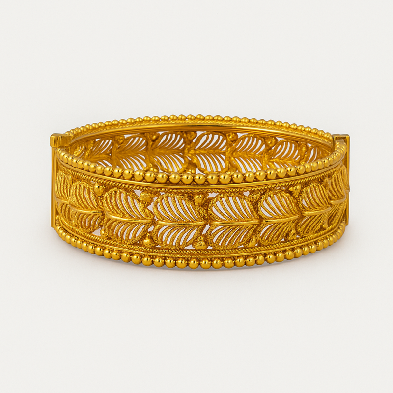 Gold Filigree Leaf Kada Bangle is an elegant piece of jewellery featuring intricate leaf-inspired motifs crafted in traditional filigree work. The open lattice design gives the bangle a lightweight yet ornate appearance, making it a perfect blend of delicacy and grandeur.