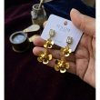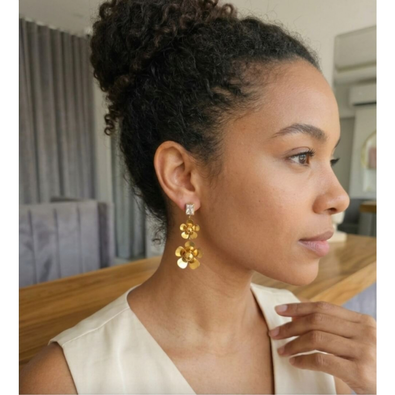 Add a touch of elegance to your look with these stunning gold floral drop earrings for women. Designed with a sparkling square crystal stud and layered flower detailing, these anti-tarnish statement earrings are perfect for weddings, parties, festive occasions, and special events.