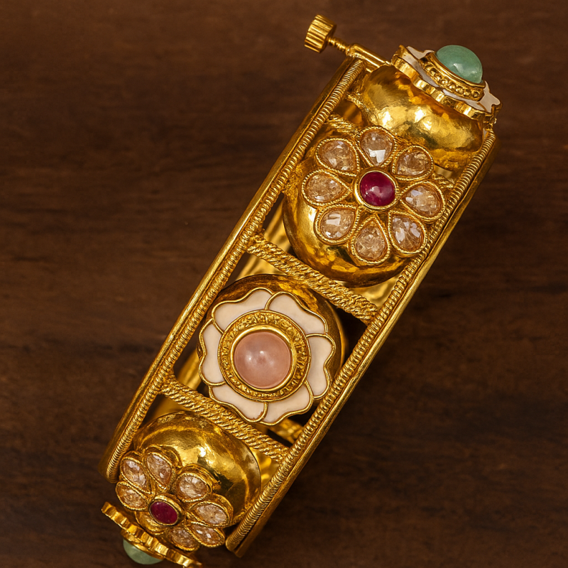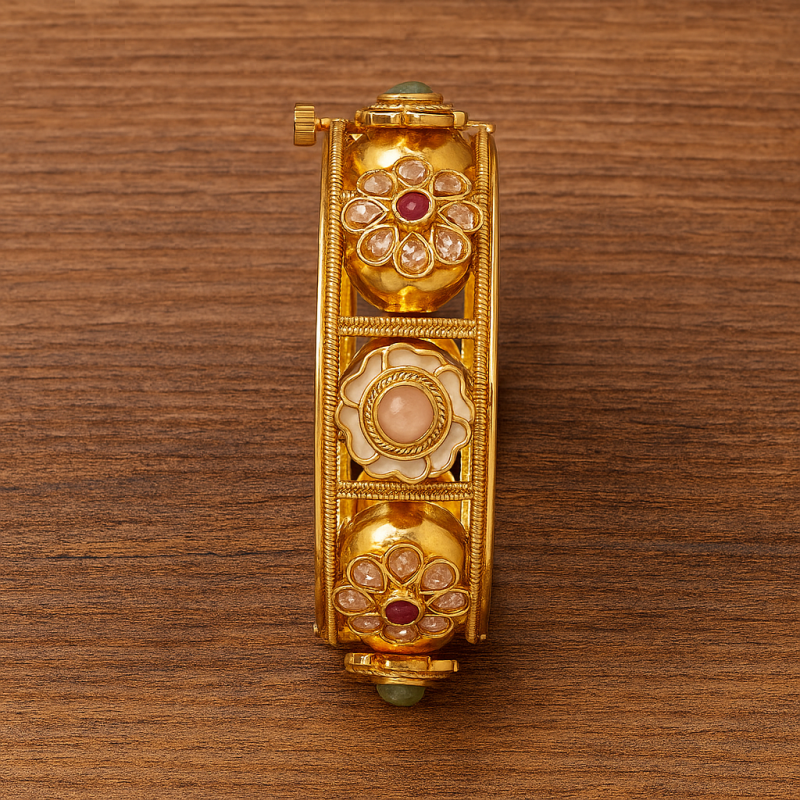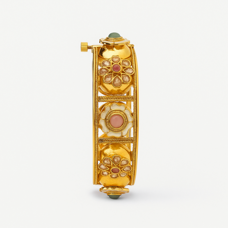 Enhance your traditional look with this Gold Floral Kundan Bangle, crafted with intricate detailing and studded with pastel stones. The bangle showcases floral motifs with delicate kundan work, highlighted by pink and green accents for a touch of regal charm. Perfect for weddings, festive occasions, or bridal wear, this statement kada adds a rich heritage appeal to any attire. Pair it with your ethnic outfits to complete a graceful, royal look. Exclusively available at Jewora, your trusted destination for premium artificial jewellery.