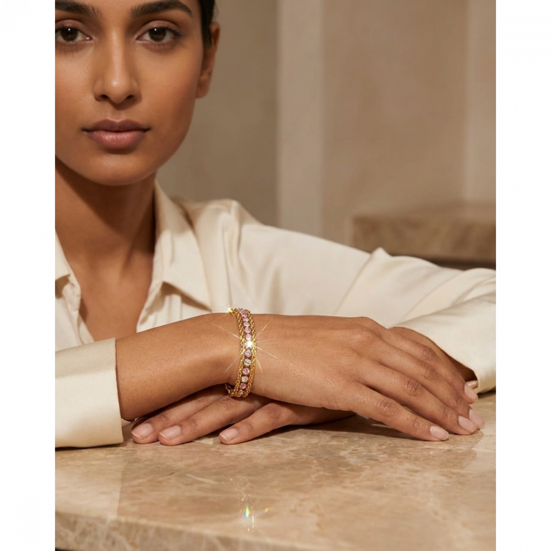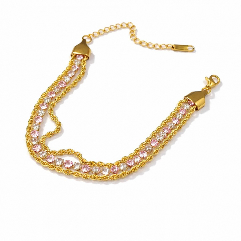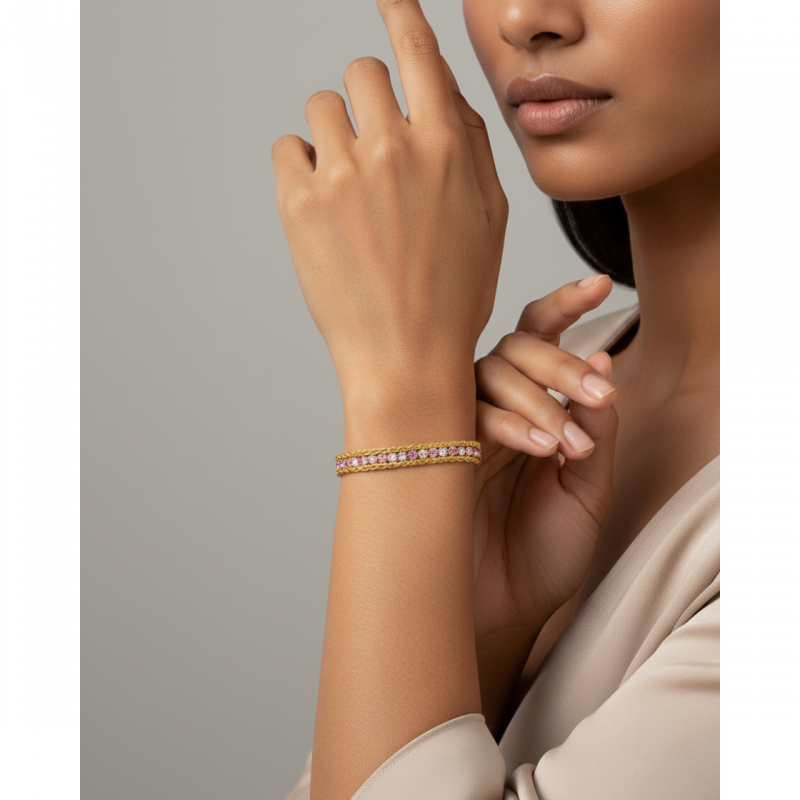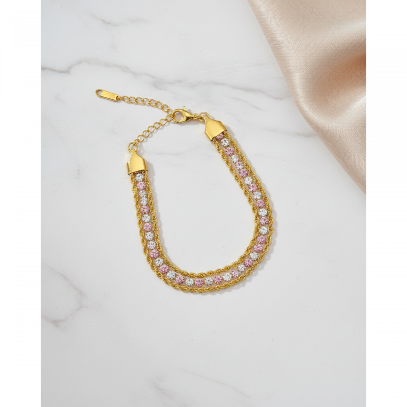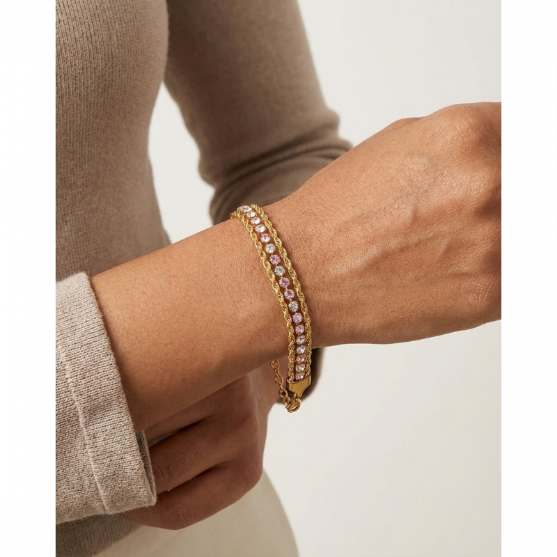 Shine from wrist to fingertip — our Gold Layered Tennis & Rope Chain Bracelet is a stunning two-in-one design featuring a sparkling pink & white CZ diamond tennis bracelet paired with a twisted gold rope chain, all in one gorgeous stacked piece. Luxury, femininity and sparkle — all on one wrist! ✨💛