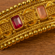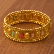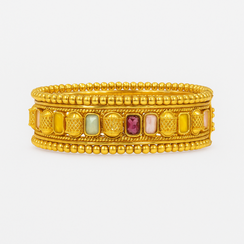 Gold Multicolor Gemstone Kada Bangle is a vibrant and artistic jewellery piece crafted with intricate lattice detailing and embedded with rectangular multicolor stones. The bangle features a perfect balance of traditional design and modern vibrance, making it a standout accessory for festive and bridal looks.
