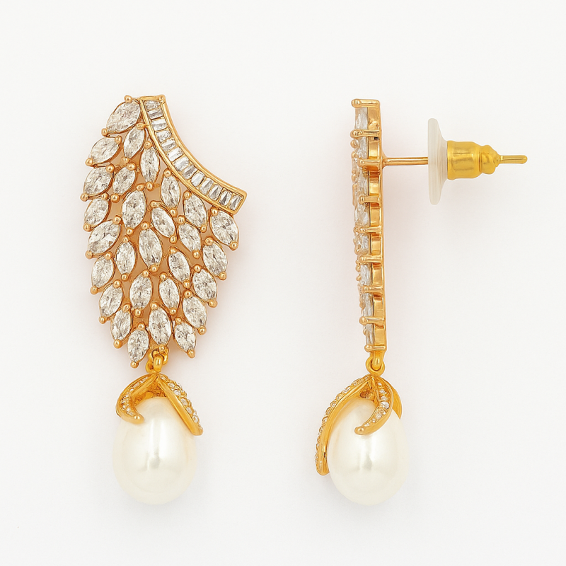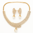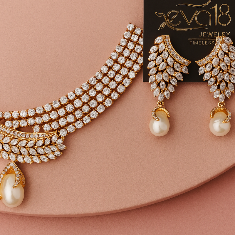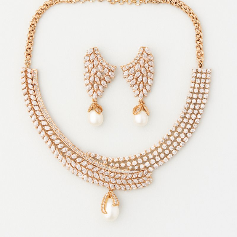 This exquisite necklace set features layered rows of shimmering American Diamonds (CZ) with a graceful leaf motif on one side. The design is enhanced by a statement pear-shaped pearl drop pendant, adding elegance and charm. Matching earrings with pearl drops complete the look, making this a versatile choice for festive occasions.
