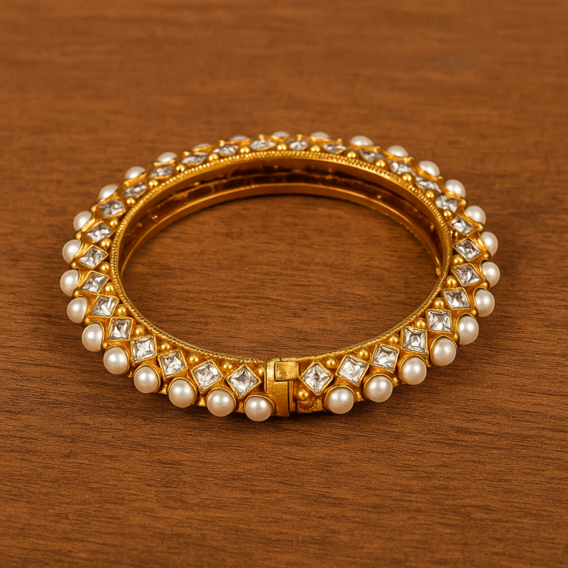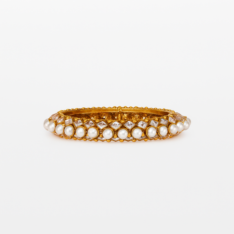 Expertly crafted from high-quality alloy and finished with durable gold plating, this kada ensures both beauty and longevity. The screw closure design provides a secure fit, while the combination of pearls and American Diamond stones brings sophistication and grace. Ideal for weddings, bridal wear, and celebratory functions, this kada is a must-have statement piece for women who love classic jewellery.