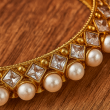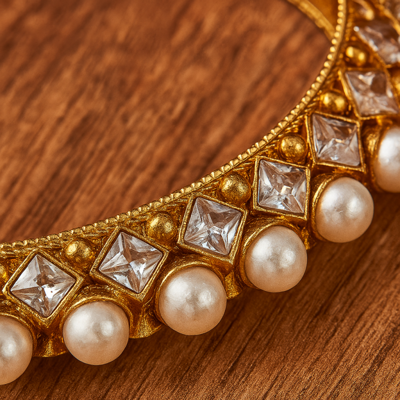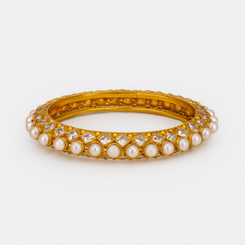 Gold Pearl Polki Kada Bangle is a timeless blend of elegance and tradition, featuring a stunning row of luminous pearls bordered with sparkling polki-style stones. The intricate setting on a rich gold base adds a royal charm, making it the perfect accessory for traditional and festive occasions.