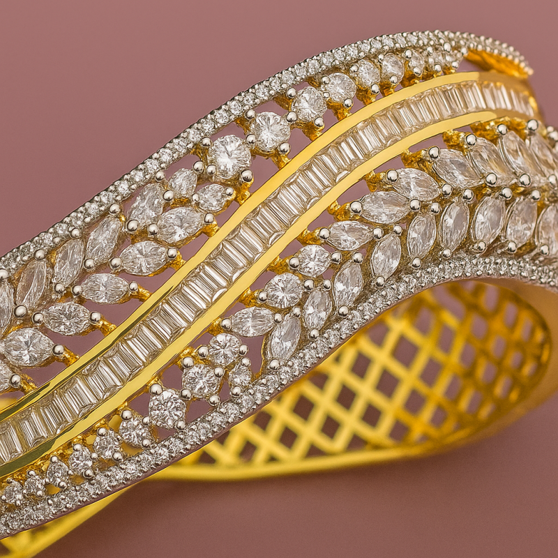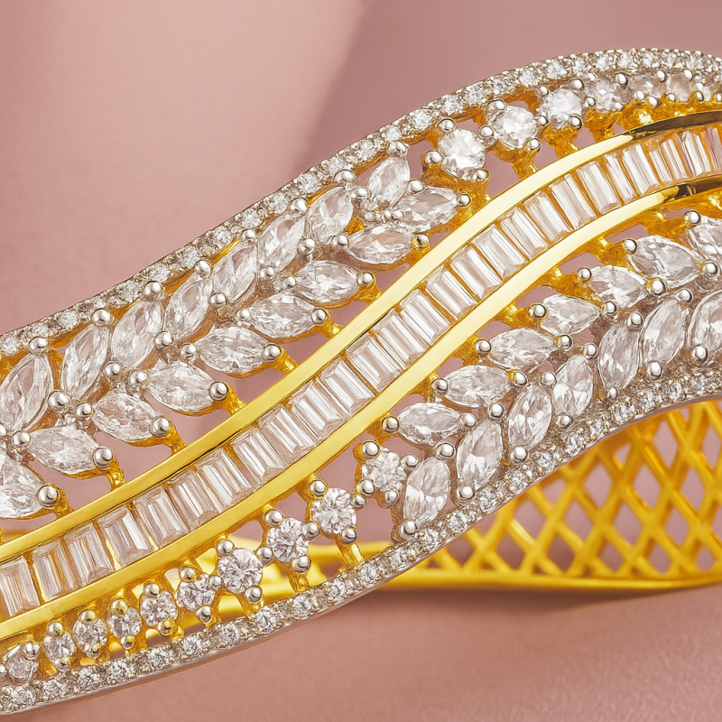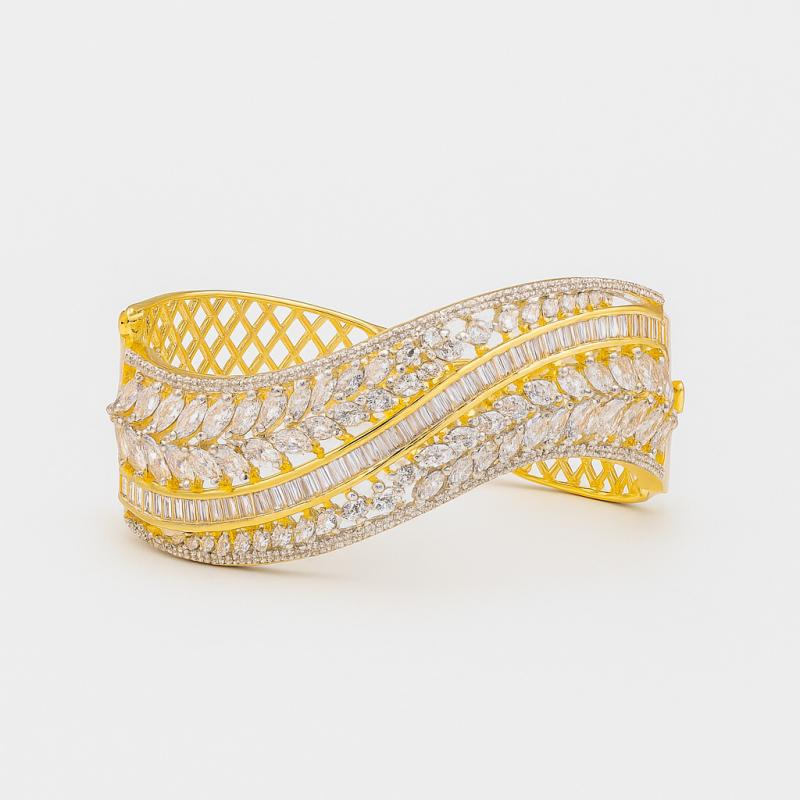 This stunning bangle is a perfect blend of tradition and modern craftsmanship. Designed with a brilliant fusion of American Diamonds in marquise and baguette cuts, it creates a sparkling wave-like pattern across the wrist. The base gold polish enhances its royal appeal, making it a versatile accessory for festive occasions, weddings, or grand parties. Its broad, structured design ensures durability while offering a luxurious feel, ensuring you stand out wherever you go. An ideal choice for women who love statement jewelry that balances elegance and glamour effortlessly. Pair it with a traditional saree or even a cocktail gown for a timeless and chic look.