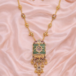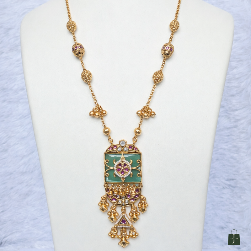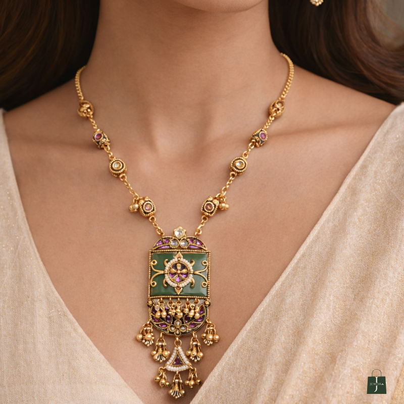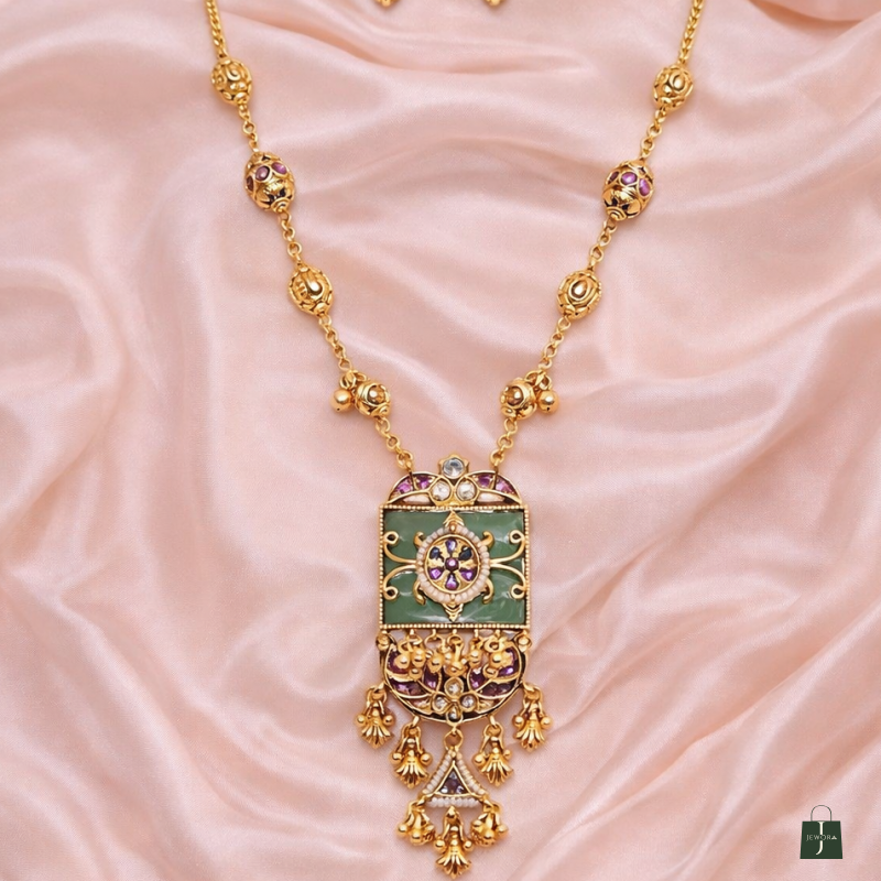 Add a touch of timeless elegance to your ethnic collection with this beautifully crafted Gold Plated Traditional Long Necklace Set, designed to reflect classic Indian artistry. The necklace features a striking square green enamel pendant, highlighted with intricate gold detailing and purple stone accents, creating a rich and regal look.