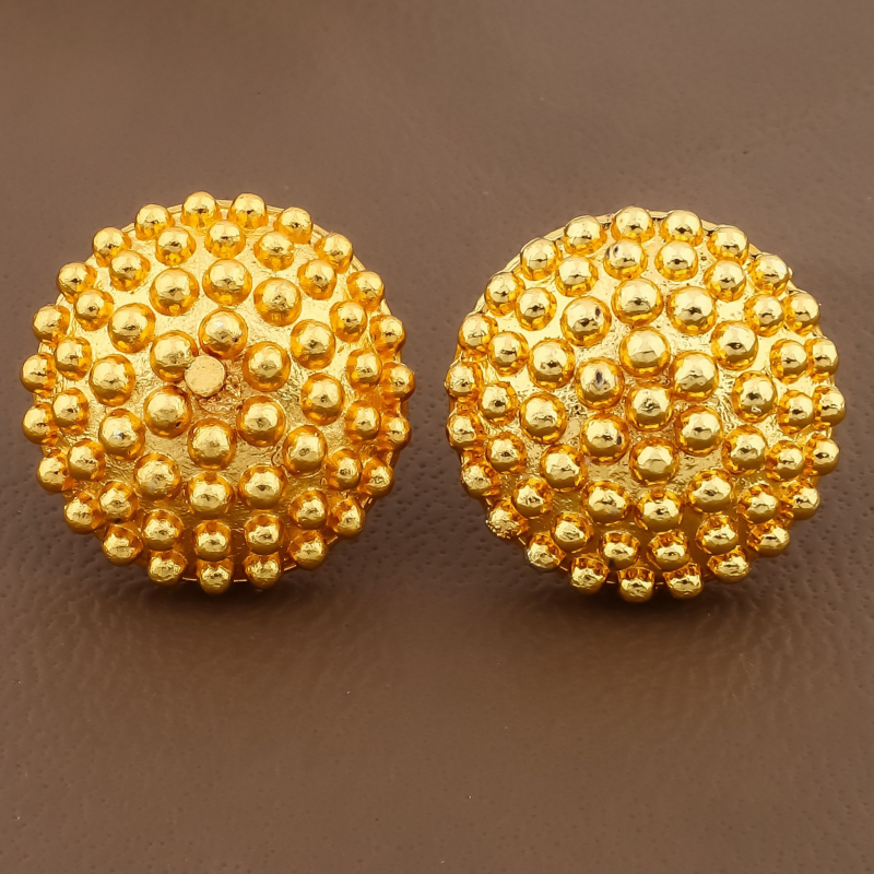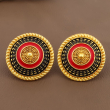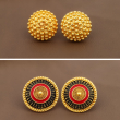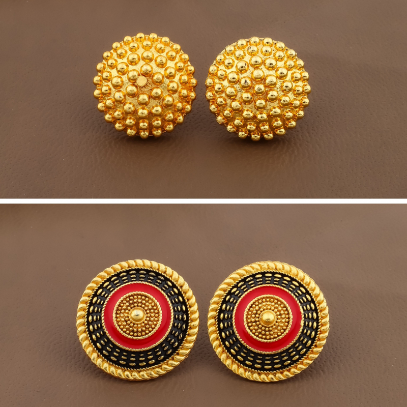 This elegant combo set includes two stylish pairs of gold-tone stud earrings designed to complement both traditional and modern outfits. The first pair features a classic dome-shaped stud adorned with closely arranged gold beads that create a rich textured look and timeless appeal. The second pair showcases a bold circular design highlighted with striking black and red enamel rings and a finely textured gold center, giving it a vibrant ethnic charm. This versatile combination is perfect for daily wear as well as festive occasions.