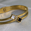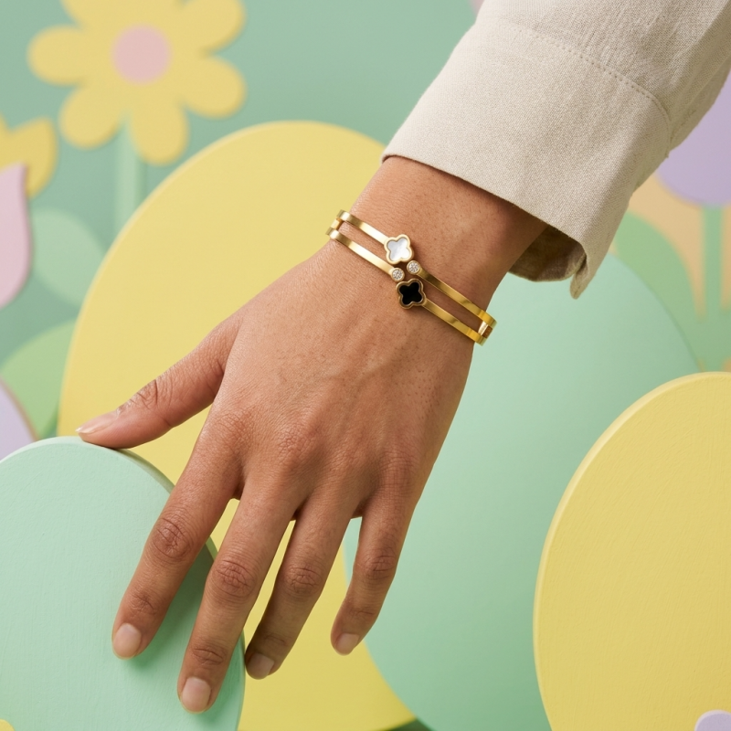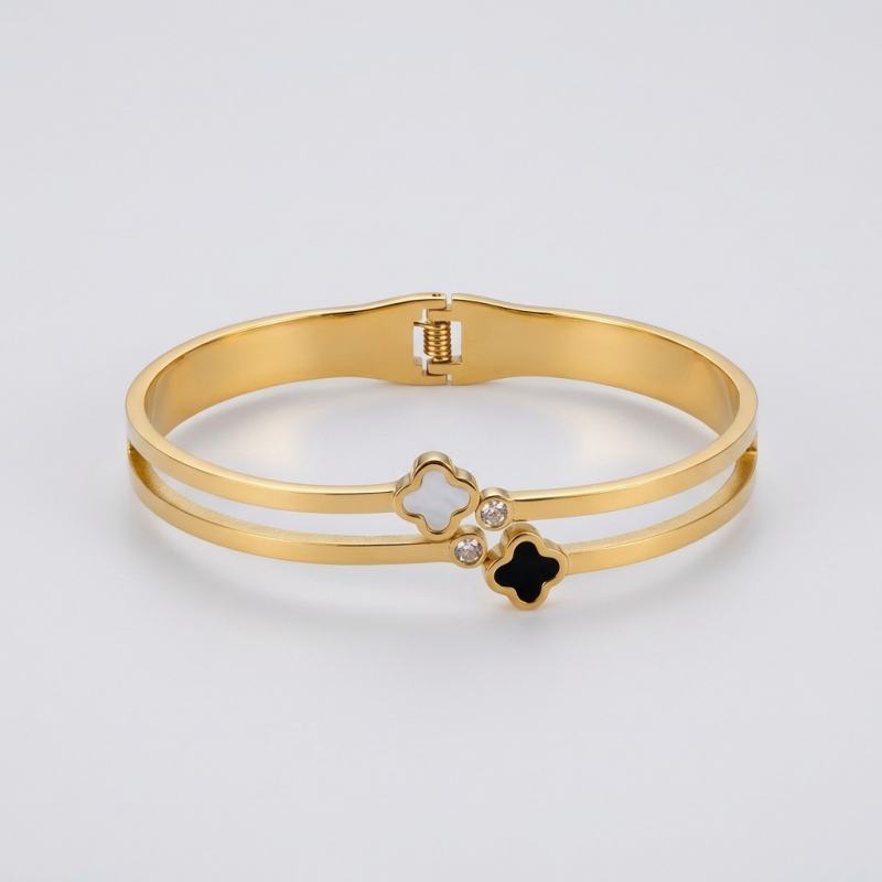 The aesthetic is classic yet contemporary. The use of contrasting black and white inlays paired with the quatrefoil motif gives the piece a "designer-inspired" look. Itβs a versatile accessory that feels both luxury and modern, suitable for stacking or wearing as a standalone statement piece.