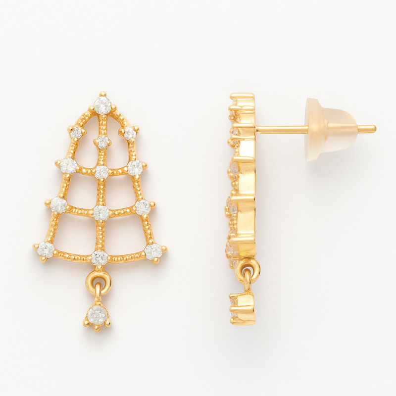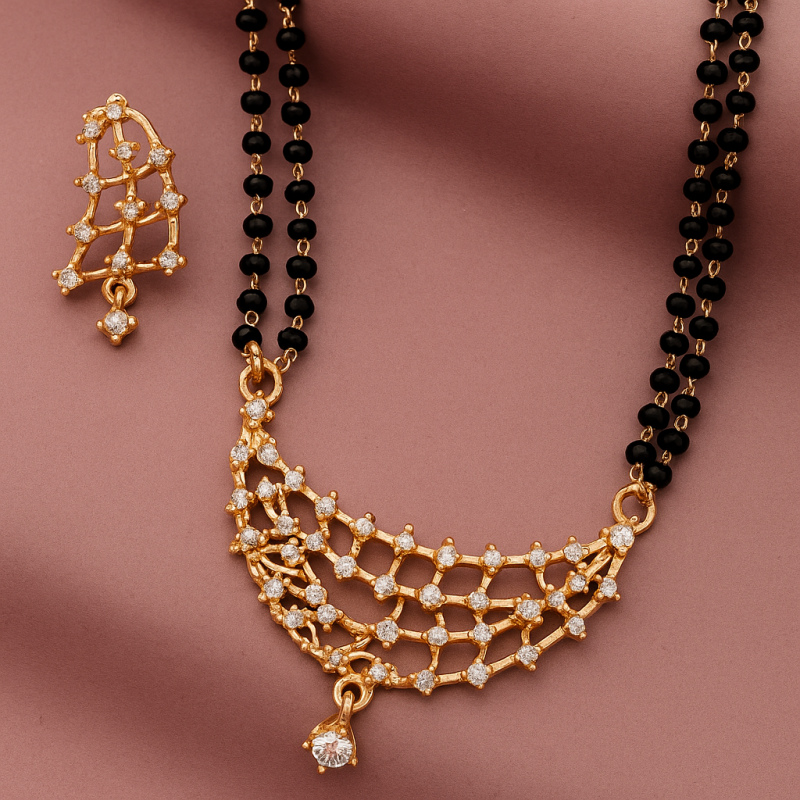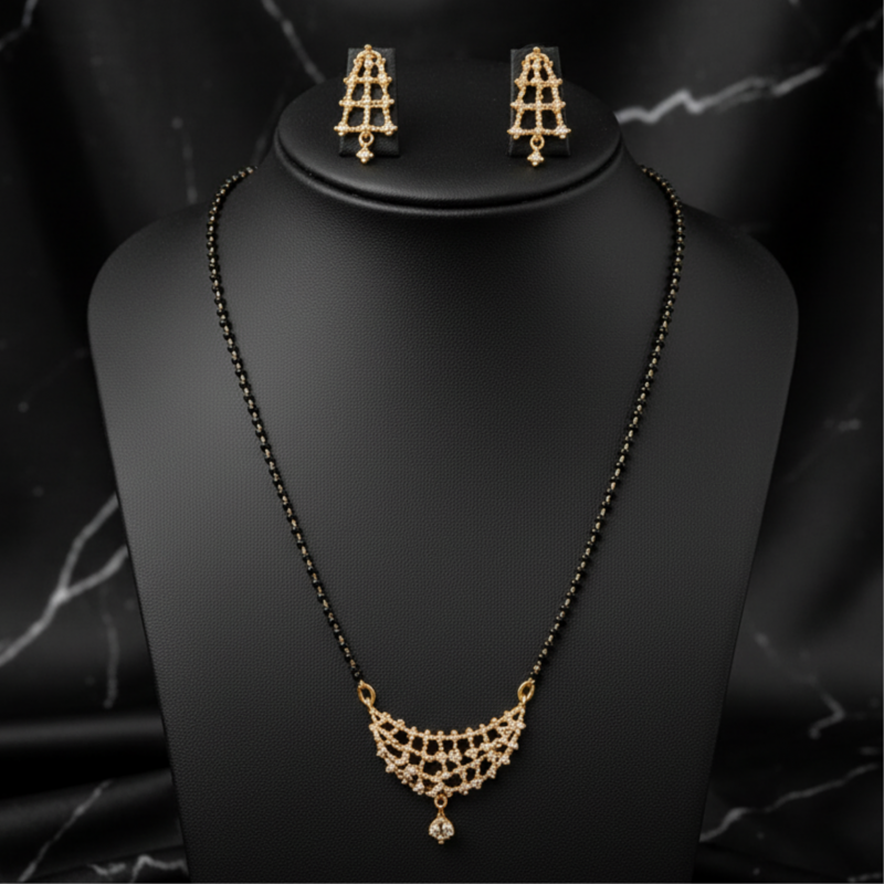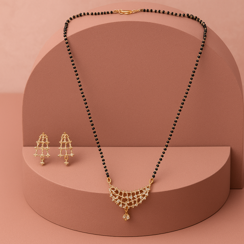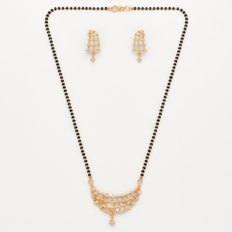 Add a touch of grace and elegance to your traditional ensemble with this intricately designed Gold-Plated Mangalsutra. The dual-strand black bead chain is beautifully complemented with a finely crafted centerpiece featuring a delicate lattice design studded with shimmering American Diamonds (CZ). This set also comes with matching earrings, perfectly balancing tradition with contemporary appeal. Whether for bridal wear or festive occasions, this Mangalsutra radiates sophistication and enduring charm. Crafted with precision, its sparkling accents and gold finish ensure you make a statement of style and devotion. A must-have for women who value timeless beauty.