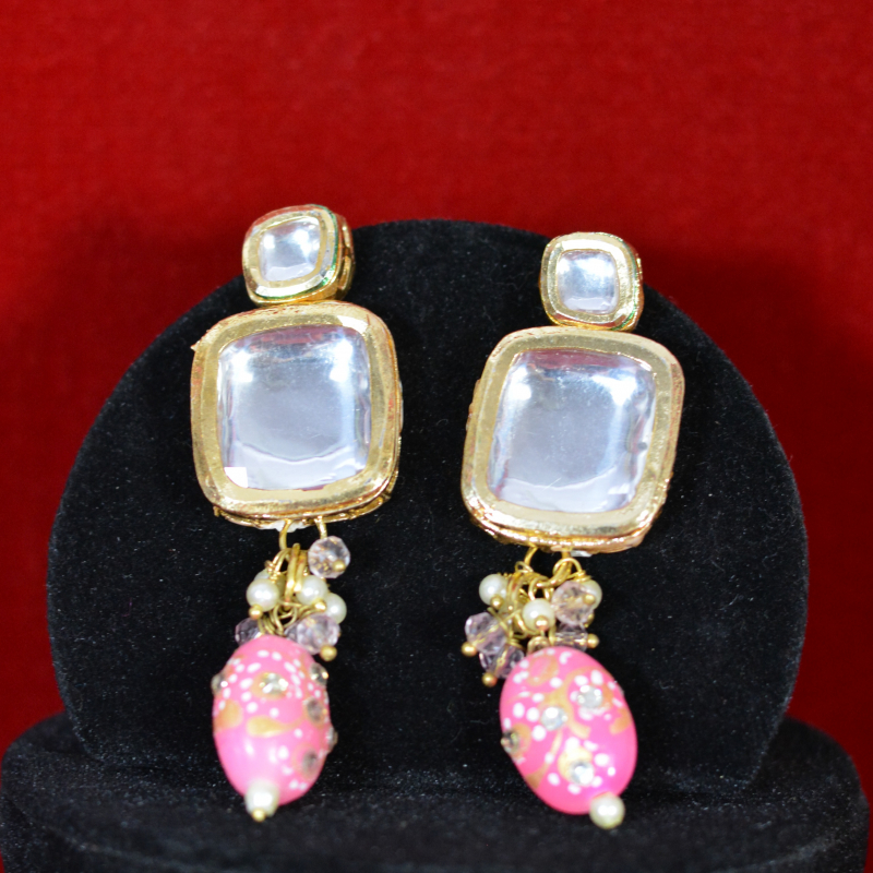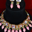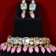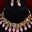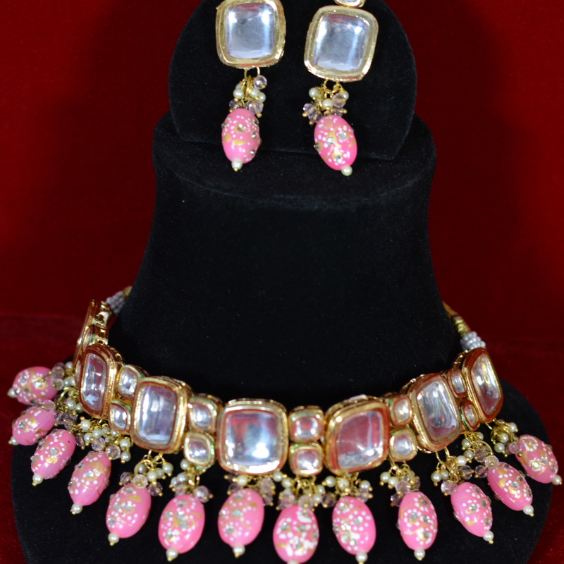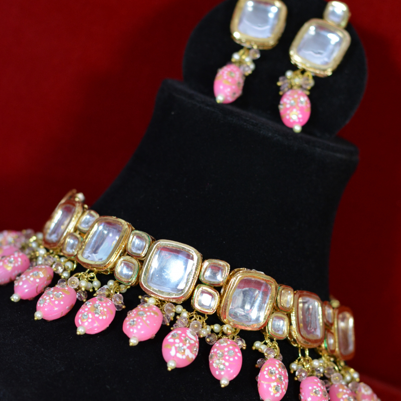 This choker set displays square-cut kundan stones set closely in a structured gold-toned frame. Soft pink drop beads with delicate detailing create a gentle contrast against the reflective stones. The compact silhouette, clean stone alignment, and subtle pearl highlights give the set a refined, elegant finish suitable for festive and wedding styling.