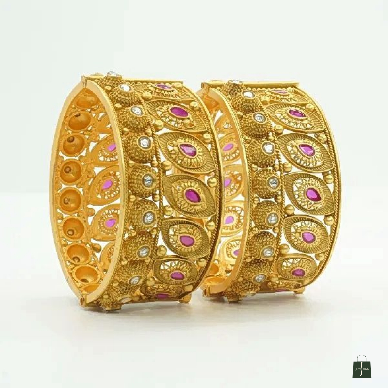 Premium quality gold plated kundan kada bangle set with pink stone ascent and white crystal detail ideal for wedding,festival and ethnic wear.
