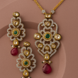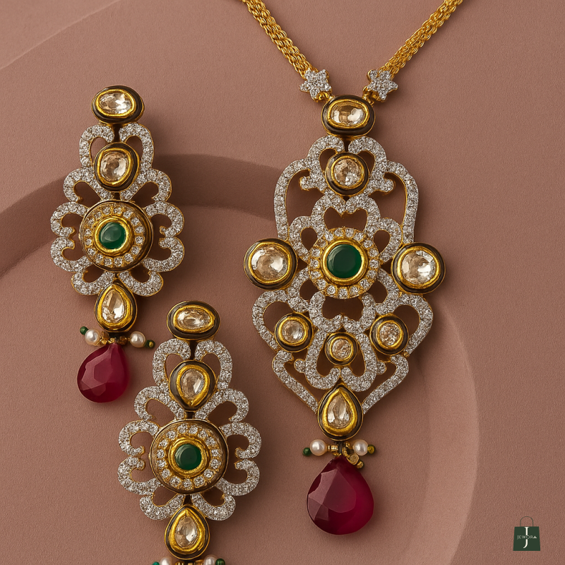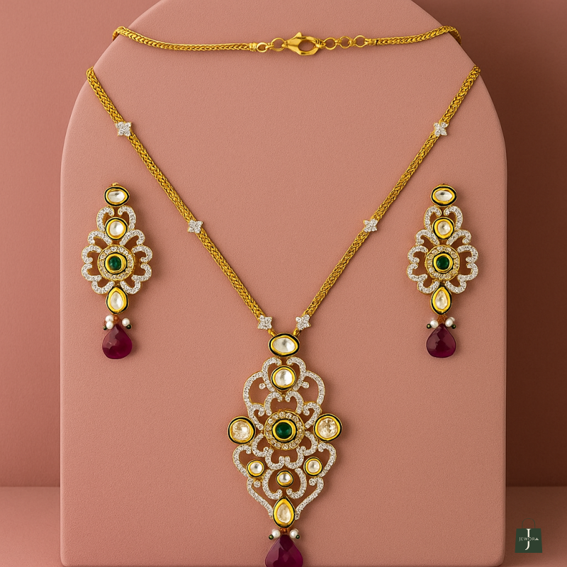 Make a statement with this exquisite Kundan Necklace Set crafted with sparkling ruby red and emerald green stones. The intricate design is highlighted with American Diamond embellishments and finished with a luxurious gold polish. Perfect for festive and bridal occasions, this set includes a finely designed necklace with matching earrings, ideal for women who want to stand out at weddings, parties, or celebrations.Available on Jewora – your trusted artificial jewellery marketplace, this necklace set combines elegance, tradition, and timeless beauty.