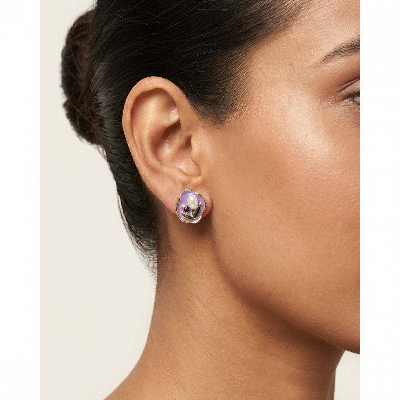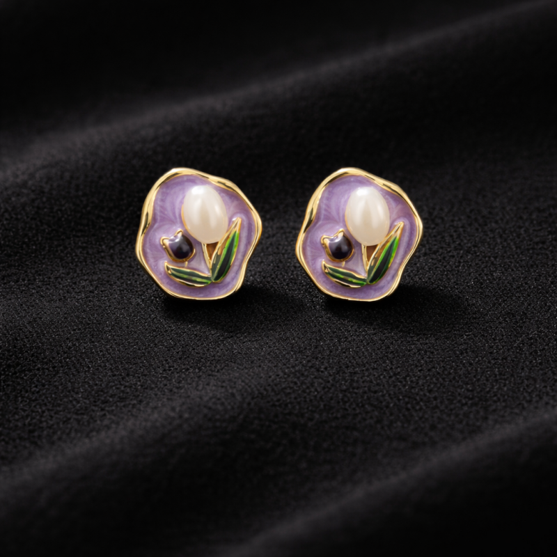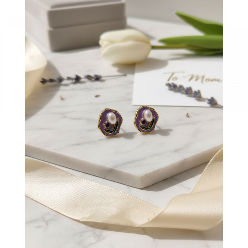 Add a soft touch of elegance to your jewellery collection with these beautiful gold plated lavender floral pearl stud earrings for women. Designed with a delicate lavender enamel flower, elegant pearl center, and green leaf detailing, these earrings create a charming vintage-inspired look.