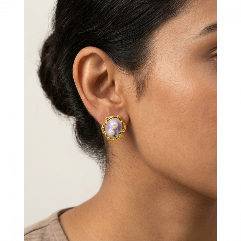 Add a soft and graceful charm to your jewellery collection with these beautiful gold plated lavender pearl stud earrings for women. Designed with a delicate floral frame, pastel lavender enamel, and elegant pearls, these earrings create a timeless and classy look.