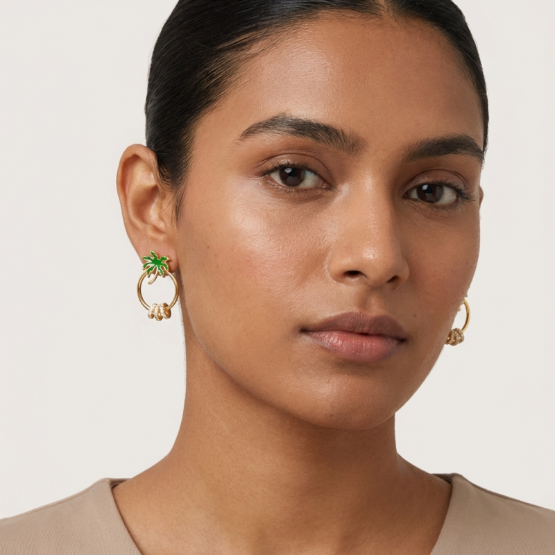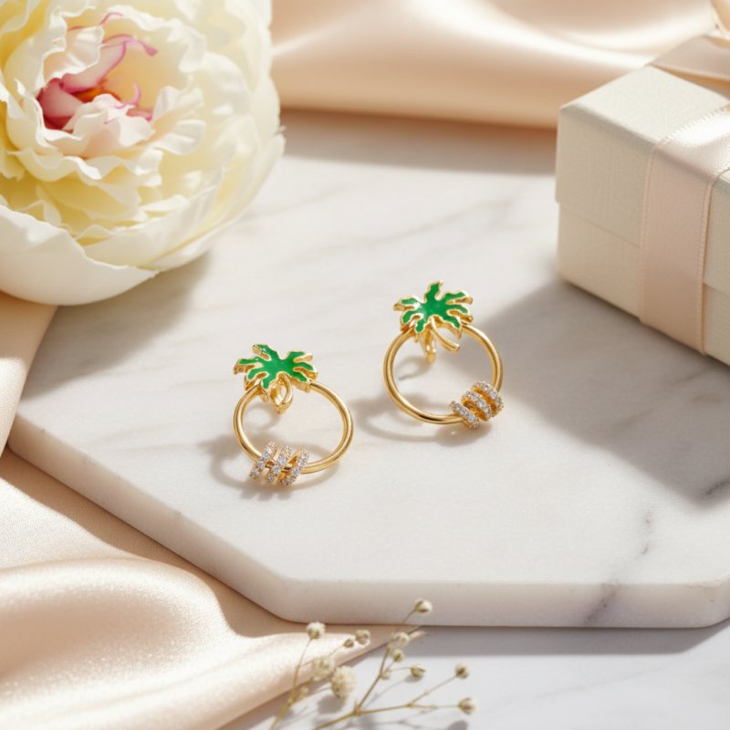 Add a playful tropical charm to your jewellery collection with these beautiful gold plated palm tree hoop earrings for women. Designed with a stylish palm tree motif and circular hoop, these earrings feature sparkling cubic zirconia stones that create a dazzling diamond-like shine.