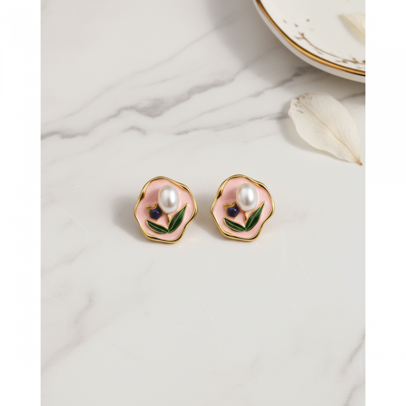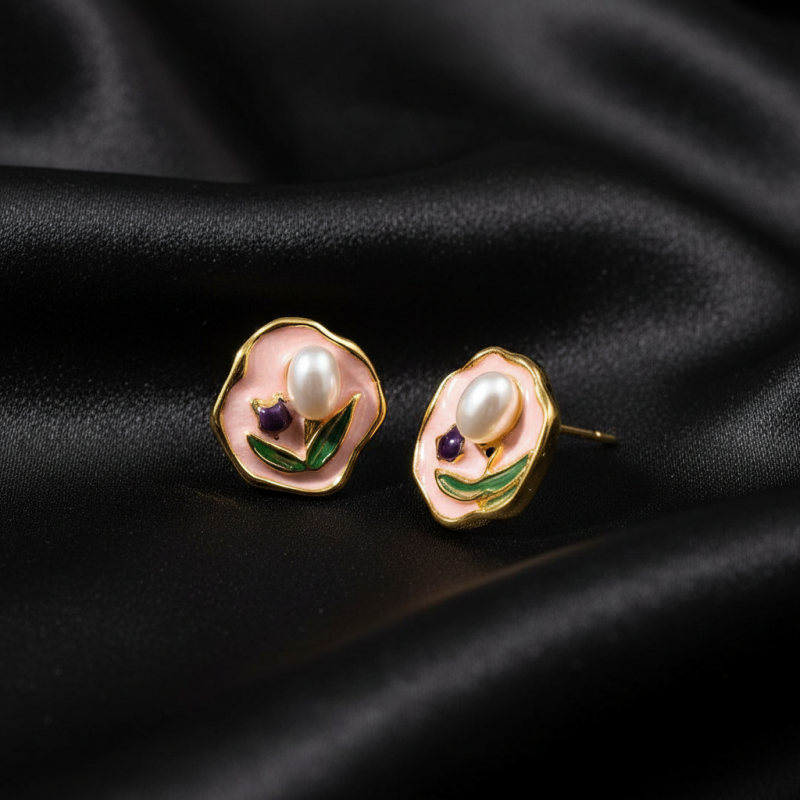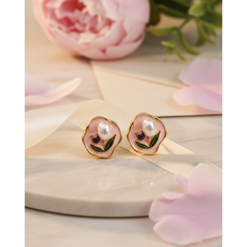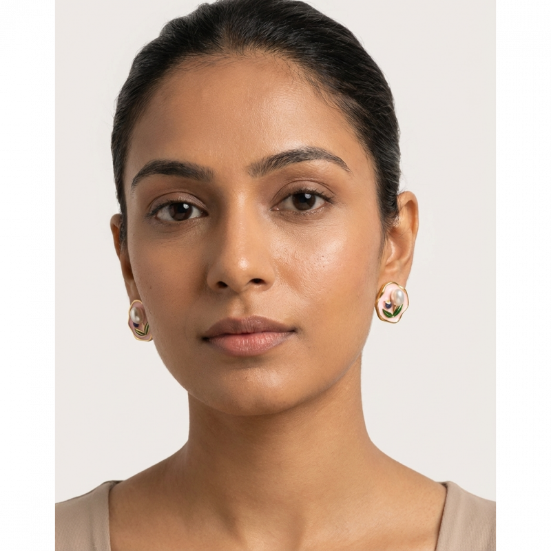 Add a soft feminine charm to your jewellery collection with these beautiful gold plated pink floral pearl stud earrings for women. Designed with a delicate pink enamel flower, elegant pearl center, and green leaf detailing, these earrings create a timeless vintage-inspired look.