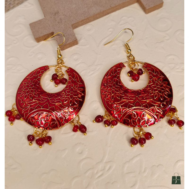 Gold Plated Red Meenakari Round Shape Chand Design Pearls Traditional Hand Painted Stylish Drop Dangle Lightweight Indian Earrings Jewelry for Women and Girls