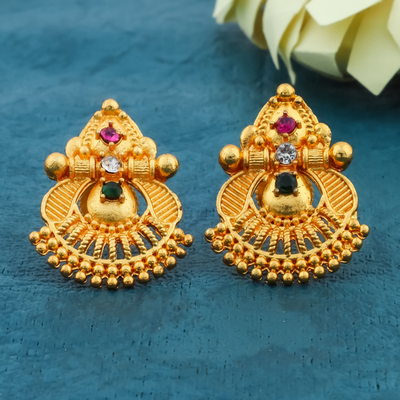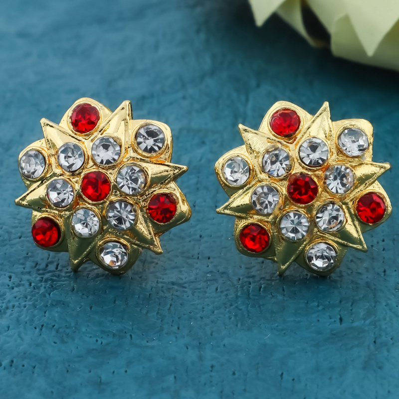 This elegant combo set features two beautifully designed stud earrings with a rich gold-tone finish. One pair showcases a traditional temple-inspired design adorned with ruby pink, clear crystal, and green stones arranged vertically with intricate gold bead detailing. The second pair features a stylish star-shaped cluster stud embellished with sparkling red and clear crystals, giving it a modern and vibrant look. This combination of traditional craftsmanship and contemporary sparkle makes the set perfect for both festive and casual occasions.