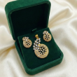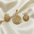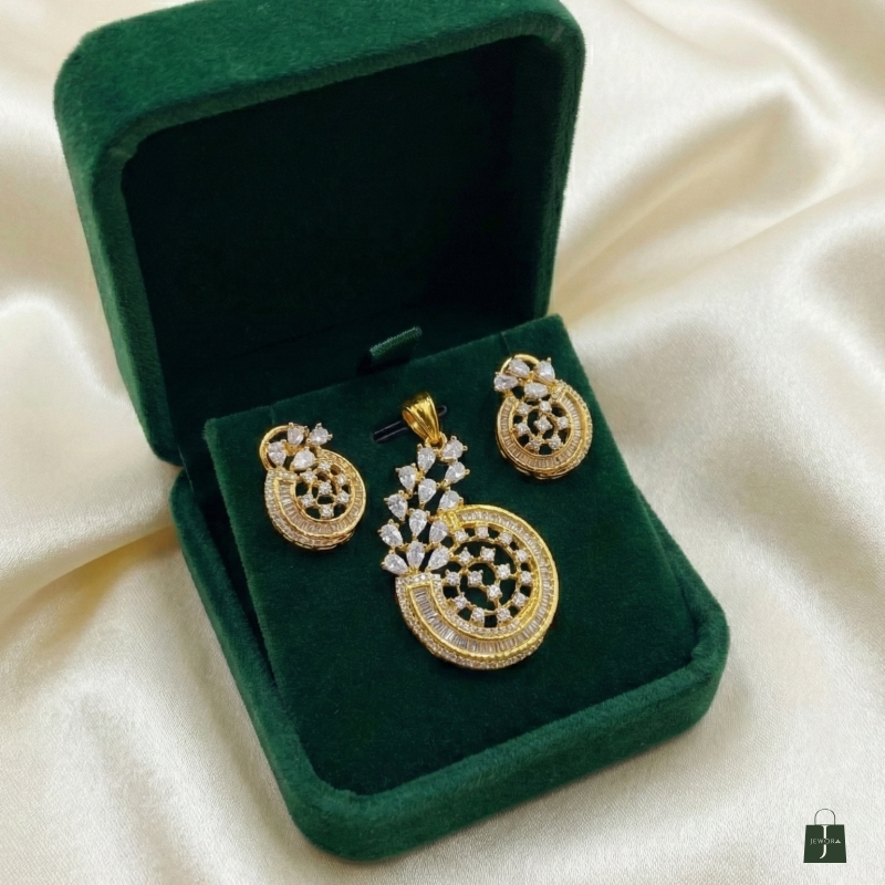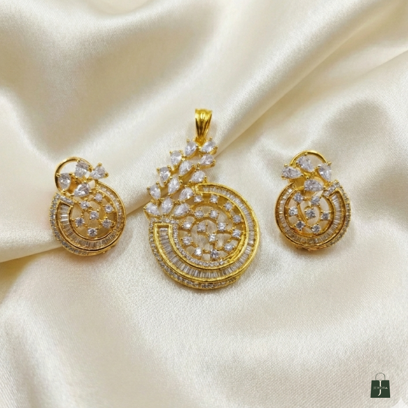 Step into refined luxury with this gold polish circular diamond pendant and matching stud earrings set. Crafted with concentric circular layers, the design features a captivating arrangement of pear and round-cut stones that create depth, movement, and radiant sparkle. The intricate detailing and warm gold polish finish lend a regal charm, making this set an exquisite choice for festive occasions, celebrations, and elegant evening wear. A statement of classic artistry blended with contemporary finesse.
