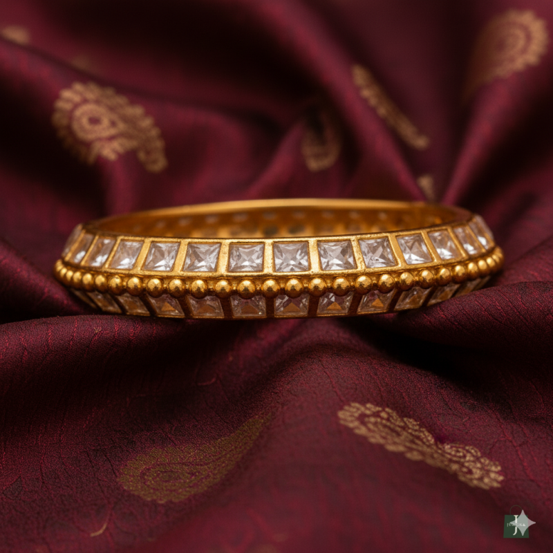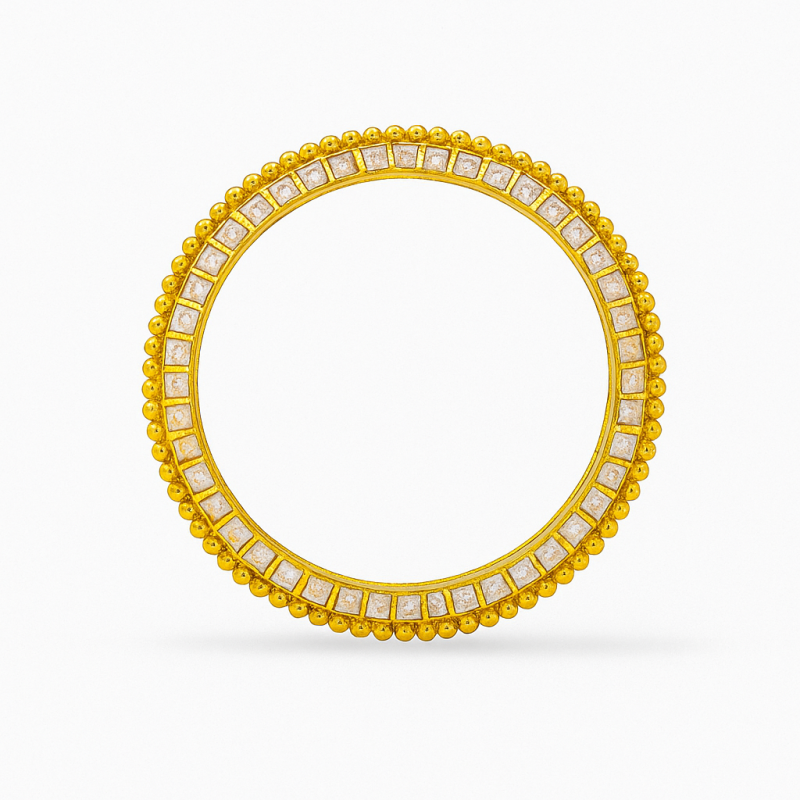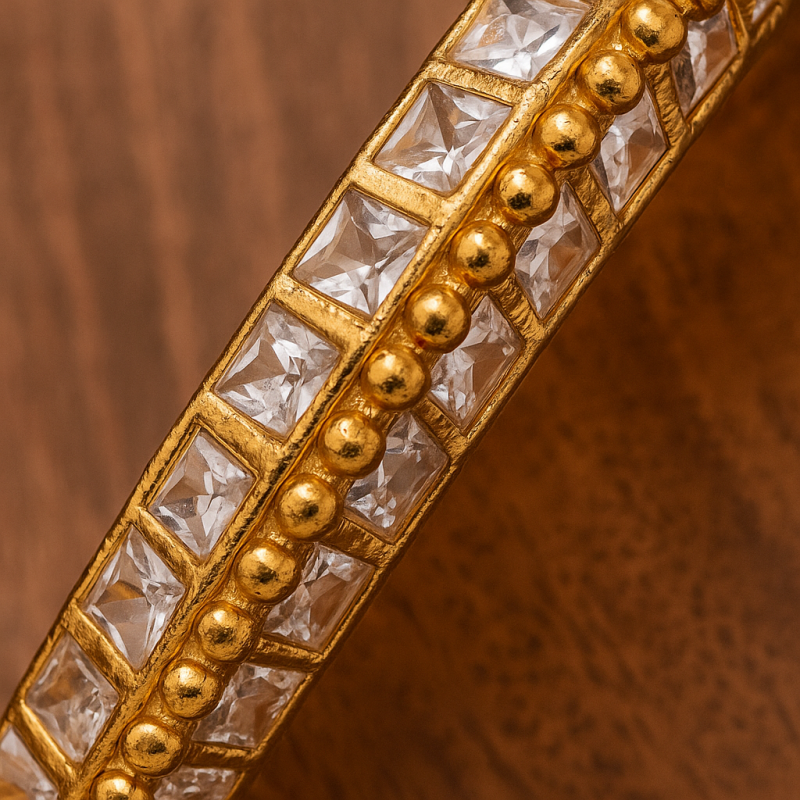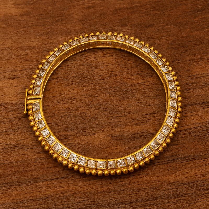 Gold Polki Square Stone Bangle is a refined piece of traditional jewellery, showcasing the timeless artistry of polki craftsmanship. The bangle features a series of square-cut American Diamond (CZ) stones neatly aligned across the surface, bordered with golden beaded detailing that adds depth and dimension to its design.